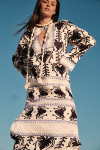 A tunic crafted from light linen, featuring wide sleeves and a relaxed silhouette. Adorned with shell details along the neckline, it blends artisanal charm with ease, making it perfect for warm-weather escapes and effortless layering. Size and Fit: Oversized fit for a relaxed silhouette. Please refer to our size chart for detailed guidance. Product Details: Closure: Slip On Composition: 100% Linen Fabrication: Light Linen Color: Ecru/Navy Made in Colombia Dimensions: Length 37.40''