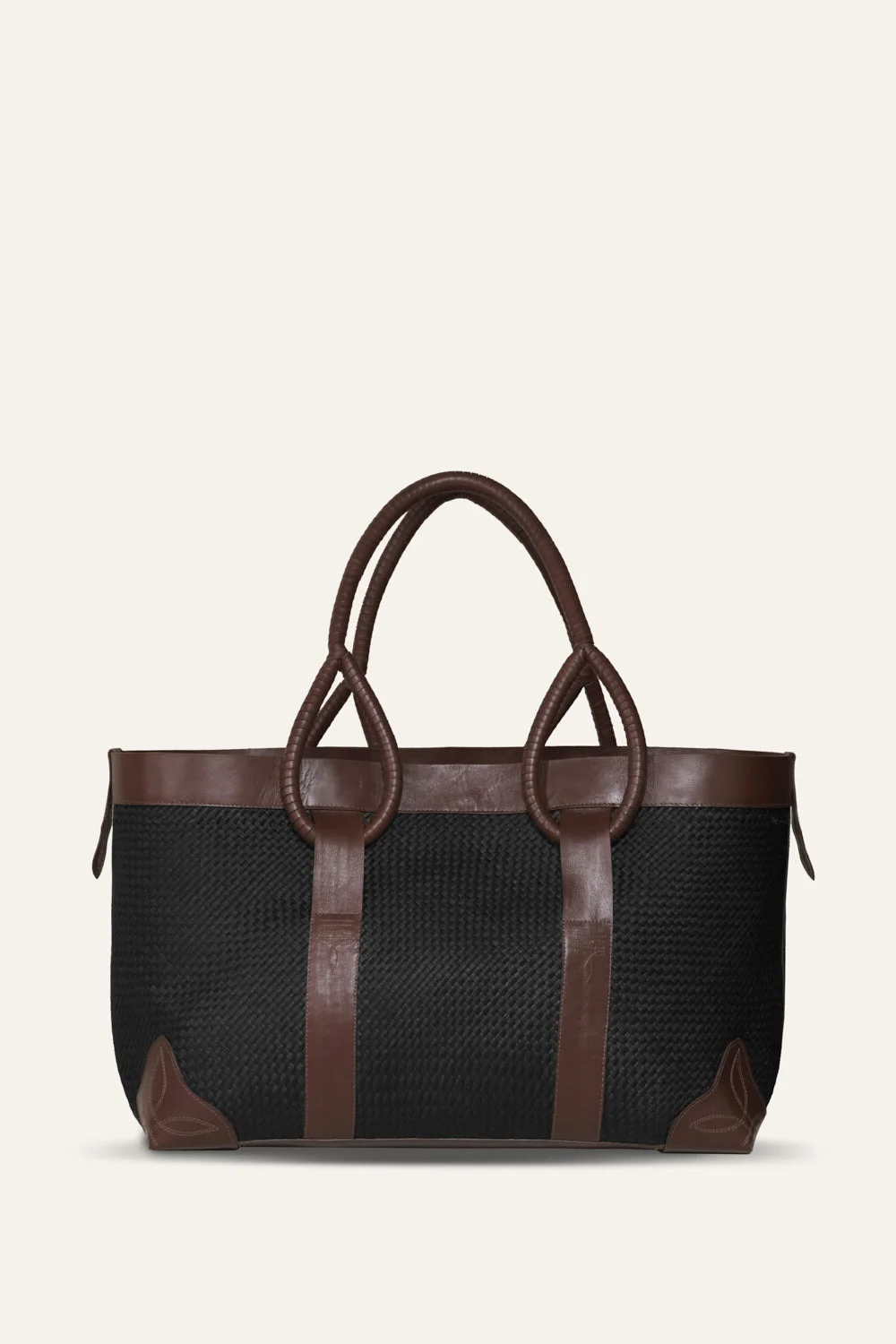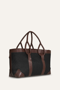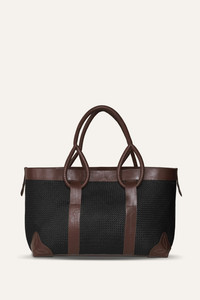 This spacious tote bag features a natural woven design, blending both style and practicality. The structured body is accented with sleek leather details, including the handles and reinforced corners, giving the bag a polished, modern edge. Its versatile design makes this bag a chic and functional accessory for any occasion. Product Details: Composition: 80% Natural Fiber (Iraca Palm), 20% Cow Leather Fabrication: Iraca Bag With Leather Handle Color: Black/Wood Made in Colombia Dimensions: Length: 21.65 inches, Width: 9.84 inches, Height: 11.81 inches, Drop: 8.27 inches