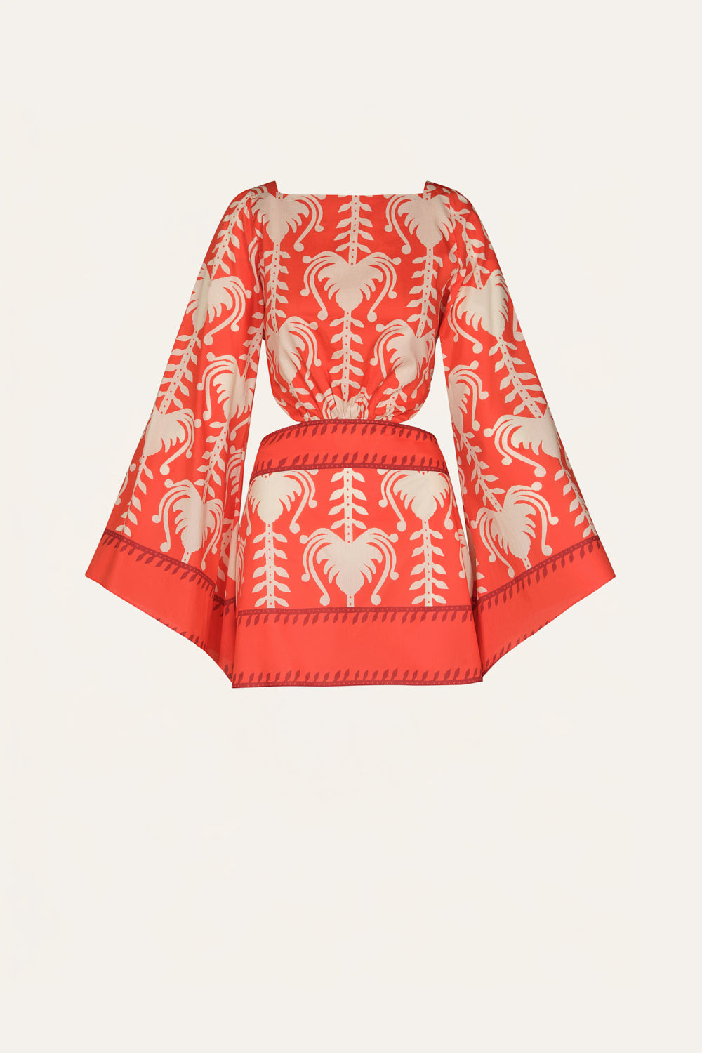 A lightweight poplin dress defined by wide sleeves and bold cutouts at the waist. The playful print and easy silhouette make it a standout piece for warm-weather dressing. Size and Fit: True to size. Please refer to our size chart for detailed guidance. Product Details: Closure: Tie At Back Composition: 100% Cotton Fabrication: Light Popling Color: Red/Ecru Made in Colombia Dimensions: Length 15.35''