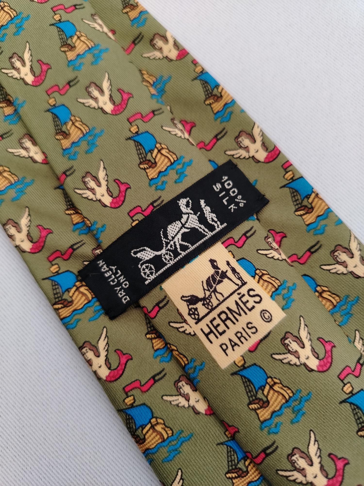Vtg Hermes Paris 7530 IA Silk Designer Necktie Sirens Vessels Pattern Green Tie