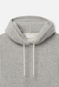 "Pullover hoodie with a relaxed, subtly cropped silhouette. Designed with a drawstring hood featuring John Elliott–branded metal tips, a kangaroo pocket at the waist, and ribbed cuffs and hem. Finished with tonal stitching throughout. Made in Japan. Boucle alpaca–wool blend fabric offers a distinctly plush hand and elevated texture, delivering warmth, structure, and softness in equal measure. Self: 11% Alpaca / 43% Wool / 11% Nylon / 35% Cotton.Rib: 80% Wool / 20% Alpaca." FABRIC & FIT Fits true to size, take your normal size. CARE GUIDE Dry Clean Only
