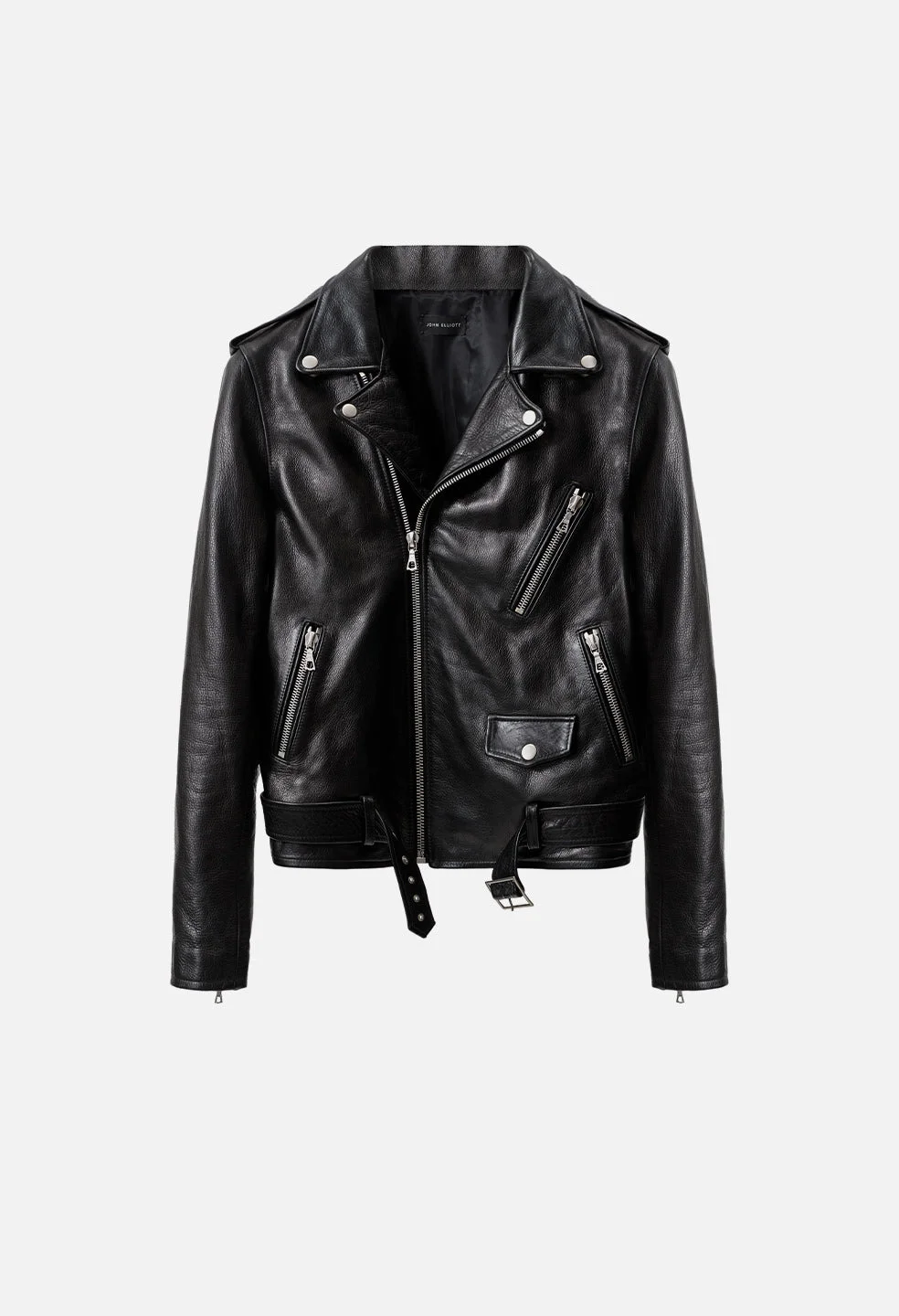 Classic leather Moto Jacket in black. Design details include epaulets, three Riri zip pockets, an interior pocket, snap lapels, a snap closure flap pocket, belted waistband, and Riri zip cuffs. Satin lined interior. This piece is handmade in Los Angeles with premium American hide. Each piece may vary slightly. 100% Leather. FABRIC & FIT This jacket is intended to fit slim and cropped. It will stretch slightly and wear in over time. If you prefer a roomier fit, we recommend sizing up one. Model is 6'2" 160 lbs and wears a size 2 / Medium. CARE GUIDE Specialist clean.
