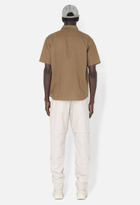 Button up short sleeve shirt in lightweight and airy linen fabric. Features a curved hem, button placket, chest pocket, barrel cuffs, and a point collar. 100% Linen. This shirt has an updated fit that's less oversized as compared to previous Cloak models. It fits true to size. FABRIC & FIT This shirt has an updated fit that's less oversized as compared to previous Cloak models. It fits true to size. Model is 6'2" 160 lbs and wears a size 2 / Medium. CARE GUIDE Hand Wash Cold With Like Colors / Do Not Bleach / Cool Iron If Needed Use Press Cloth / Hang To Dry