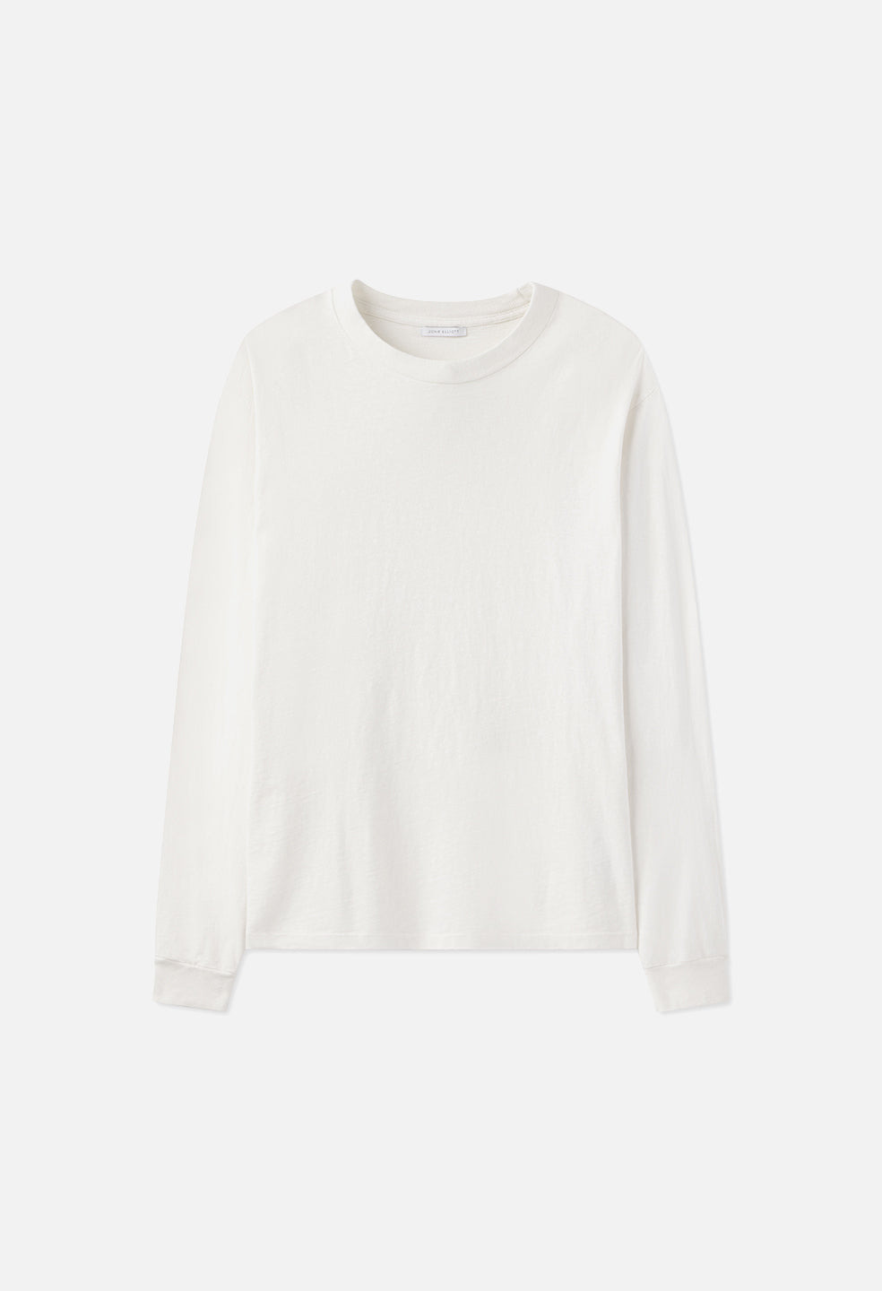 Oversized long sleeve tee with a relaxed neck and slightly longer than average length. This tee is designed with recycled cotton and features a vintage-inspired blind stitch detail at the neck, sleeves, and hem. Ribbed neck and cuffs. Made in Los Angeles. 100% Cotton. FABRIC & FIT This tee is intended to fit oversized. If you do not prefer an oversized fit, we recommend sizing down one. Model is 6'2" 160 lbs and wears a size 3 / Large. CARE GUIDE Machine wash cold, hang to dry.