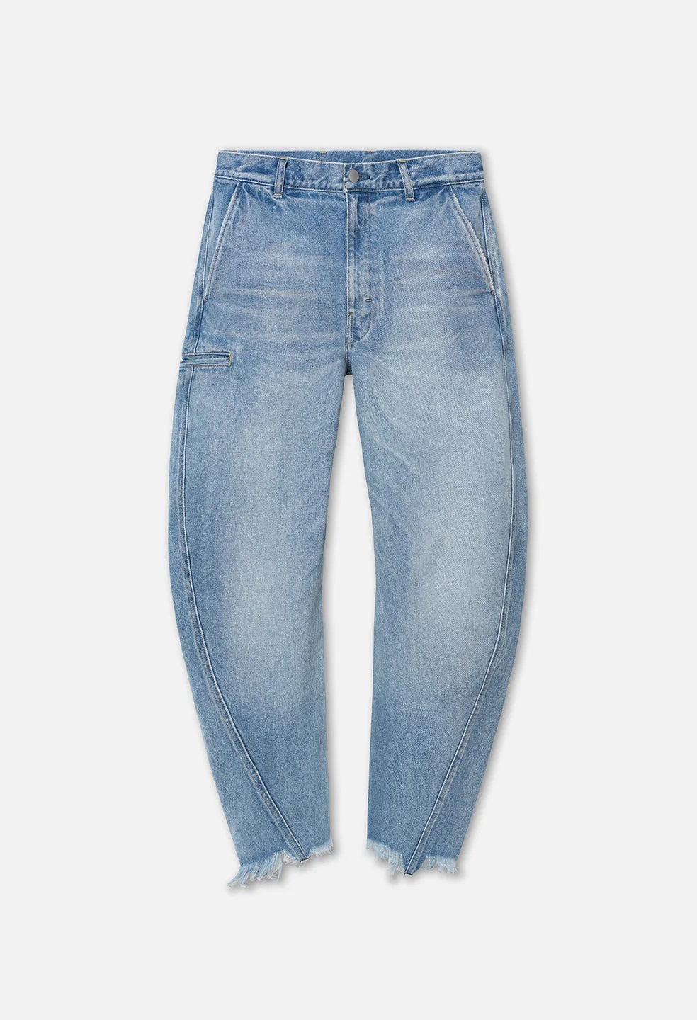 Relaxed and cropped fit trousers in 90's inspired light indigo wash. Subtle distressing throughout. Asymmetrical seams are designed to create shape. These pants feature two slant pockets at the front, two welt pockets at the back, and a welt pocket at the side. Belt loops at the waist. Zip fly. Raw hem detailing. Made in Japan. Sendai Trousers are now offered in traditional numbered sizing. We suggest to take your true size. 100% Cotton. FABRIC & FIT Sendai Trousers are now offered in traditional numbered sizing. We suggest to take your true size. Model is 6'1" 160 lbs with a 31" waist and wears a size 31. CARE GUIDE Machine Wash Cold, Wash With Like Colors, Do Not Bleach, Do Not Iron, Do Not Tumble Dry