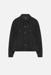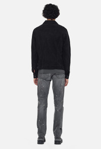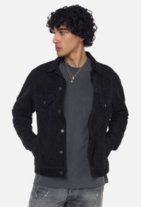 Classic type III trucker jacket crafted in premium European suede. Button closure with two pointed flap pockets, side pockets, and waistband tabs. Fully lined. Branded hardware. Tonal stitching. Made in Los Angeles. Our classic Thumper Jacket silhouette reaches cutting edge technology in suede construction. Organic hides are cut and sewn by leather artisans and natural wax is then applied at the seams by hand for a lived-in finish. Due to the special treatment on this garment, each piece is completely unique, with slight variance in finish. 100% Suede Leather. FABRIC & FIT Fits true to size, take your normal size. Model is 6'1" 160 lbs and wears a size 2 / Medium. CARE GUIDE Specialist clean.