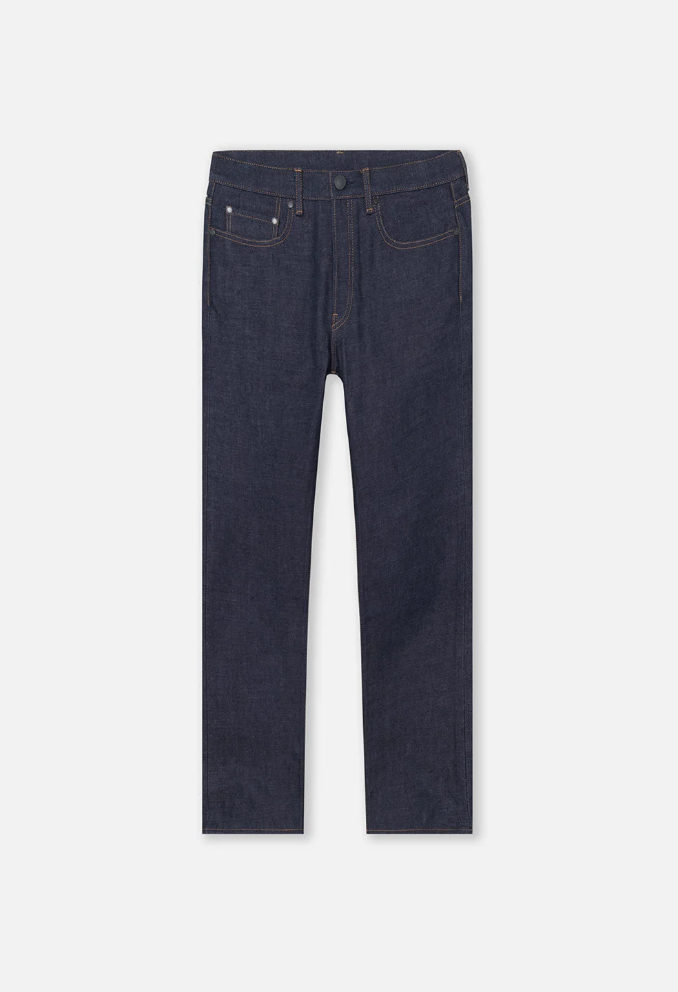 Classic straight leg fit with a medium rise and slight taper from the knee. Raw 12 oz. 3X1 Japanese denim. Top-dyed indigo warp with white fill yarn. Five pocket design with a button fly. Hidden rivets at the back pockets. Classic contrast stitching. Made in Japan. 100% Cotton. FABRIC & FIT Fits true to size, take your normal size.Model is 6'1" 160 lbs with a 31" waist and wears a size 31. CARE GUIDE Machine Wash Cold, Wash With Like Colors, Do Not Bleach, Do Not Iron, Do Not Tumble Dry
