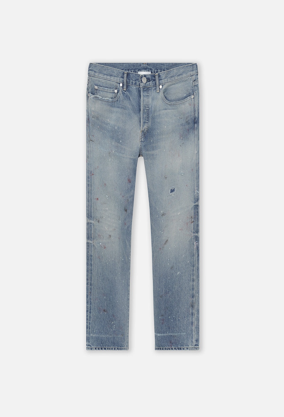 Selvedge Japanese denim in washed indigo. Five pocket design with a button fly. Classic straight leg fit with a medium rise and slight taper from the knee. Inspired by a vintage find, this pair features paint and bleach detailing with subtle destroys and repairs throughout. Redline selvedge ID. Contrast stitching. Made in Japan. The Daze is inspired by vintage Americana denim. Details include branded hardware, hidden rivets, a bar tack detail at the back pockets, bold stitch lines, and chain-stitching at the hem. 100% Cotton. FABRIC & FIT Fits true to size, take your normal size. CARE GUIDE Machine Wash Cold, Wash With Like Colors, Do Not Bleach, Do Not Iron, Do Not Tumble Dry