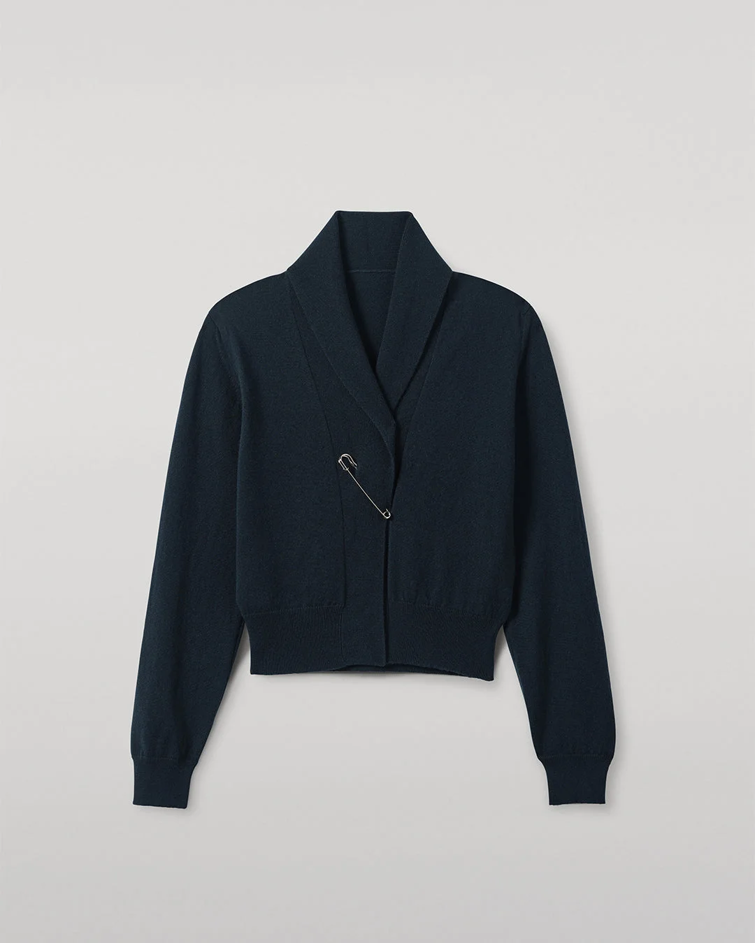Heritage-inspired classic shawl-collar cardigan with authentic vintage detailing, including a fully fashioned, one piece-shaped collar, subtly cropped silhouette, and traditional Scottish kilt pin fastening. Crafted from the finest woollen-spun cashmere and tightly knitted for an authentic Scottish hand feel. PRODUCT DETAILS • Cropped Fit • 100% Cashmere • Bottle Green • Kilt Pin Fastening • With indent circles for Kilt Pin positioning • 2-Ply Construction • Made In Scotland • Model is 5ft10 / 178cm and wears a S • KAP05707