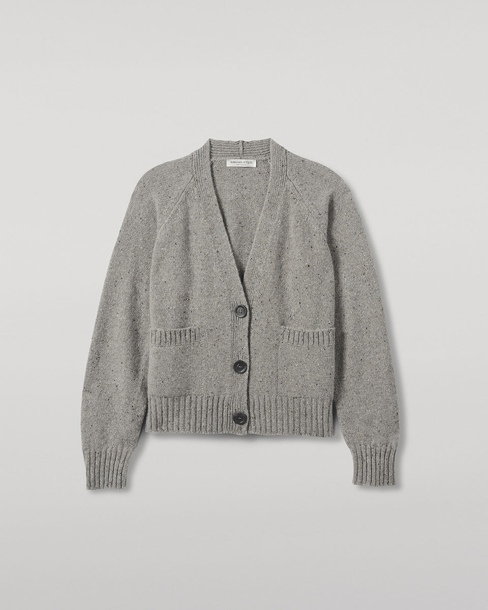 Boxy cardigan in Donegal cashmere with raglan sleeves and horn buttons. Our exclusive nepped yarn adds rich texture. Donegal knitwear is crafted using multi-tonal yarns, spun with flecks of contrasting colour to create a beautifully mottled, heathered effect. At Johnstons of Elgin, we dye and spin our own Cashmere Donegal yarn, combining carefully selected hues from our seasonal palette. We then twist in complementary colours to create marls that are exclusive to us. PRODUCT DETAILS 100% Cashmere Model is 5ft10 and wear a size S Made in Scotland Code: KAC05090