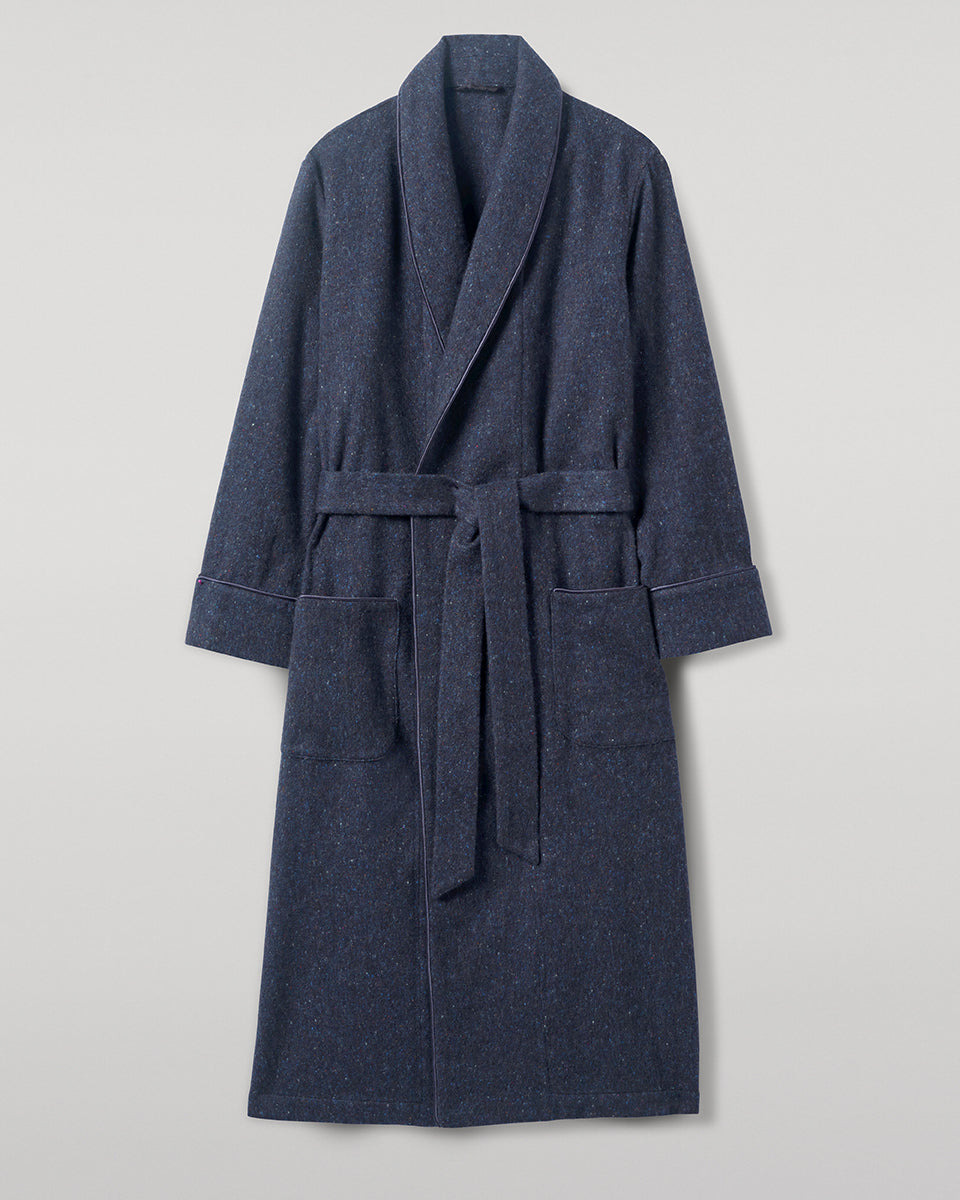 Level up your downtime with this luxe loungewear piece in a classic navy hue. Featuring soft tailored shoulders and a generous wrap so you can cocoon in Cashmere. The mock cuff and generously sized pockets are finished with satin piping. Made in the UK. PRODUCT DETAILS 100% Cashmere Unlined with satin-piped edges and cuffs, a Cashmere belt and patch pockets. Model is 5ft10 and wear a size S Made in Scotland Code: TA000529
