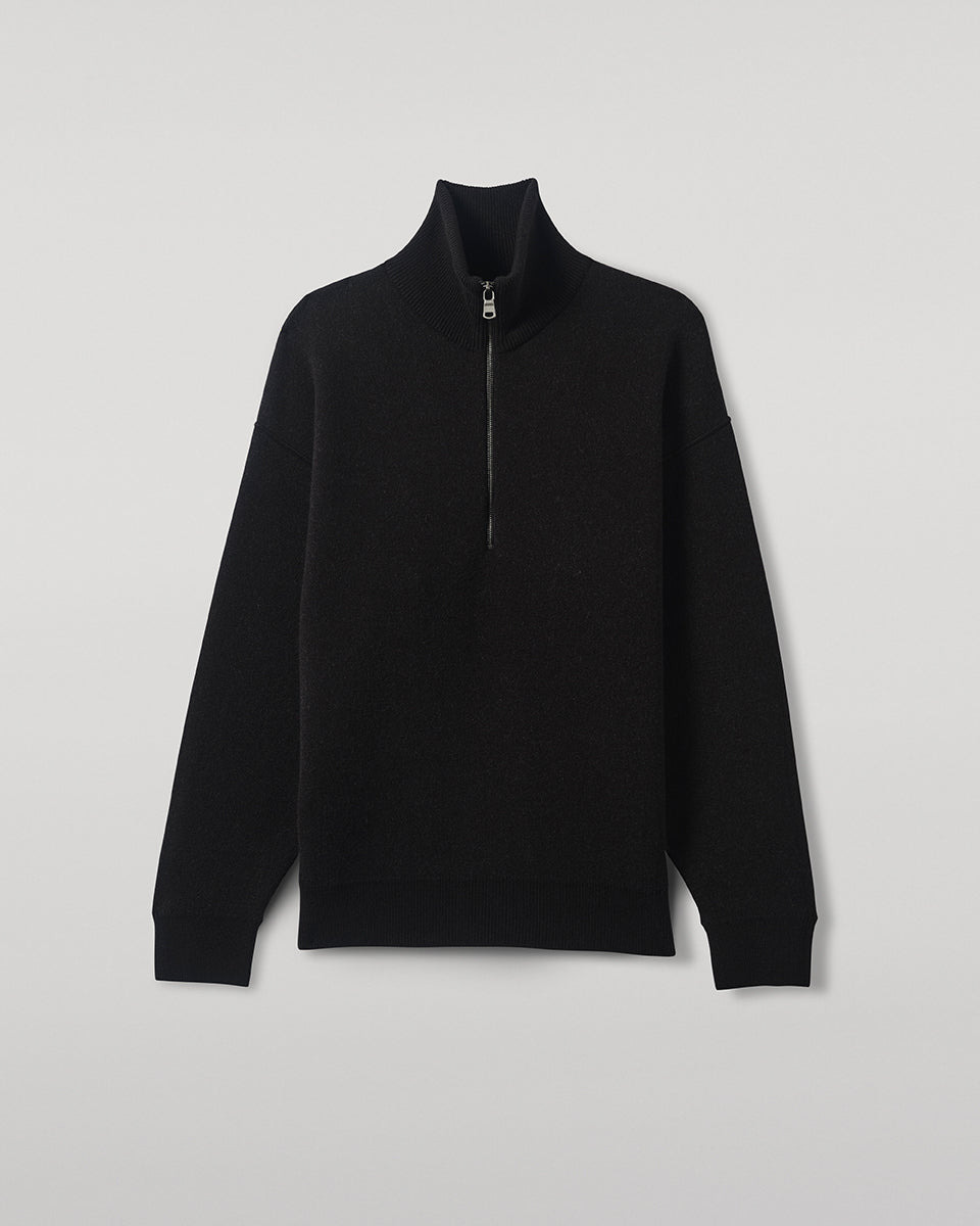 A versatile half-zip style with double-face construction: soft cashmere exterior and merino interior. Smooth jersey finish for everyday wear. PRODUCT DETAILS 55% Cashmere 35% Merino Wool 10% Elastane 4 Ply: Four individual strands are twisted to create this yarn, producing a durable, light-mid knit. Model is 6ft2 and wear a size M Made in Scotland Code: KBA01023