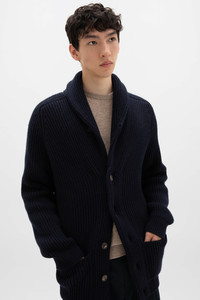 Our Shawl Collar Cardigan crafted in 100% cashmere, offers a dense ribbed texture with buffalo horn buttons and practical patch pockets. PRODUCT DETAILS 100% Cashmere Buffalo Horn Buttons 8 Ply: Eight individual strands are twisted to create this yarn, producing a durable, medium-thick knit. Model is 6ft and wear a size M Made in Scotland Code: KAC05183