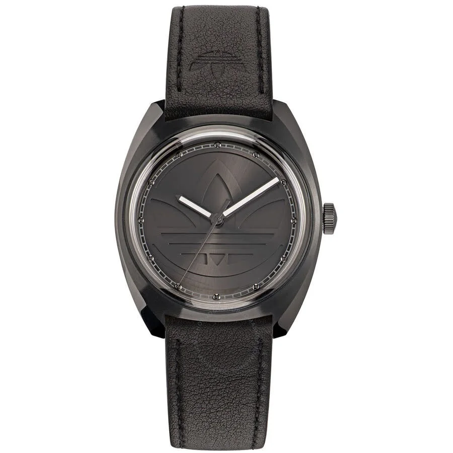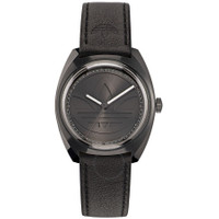 Black stainless steel case with a black leather strap. Fixed black stainless steel bezel. Black dial with black hands and index hour markers. Minute markers around the outer rim. Dial Type: Analog. Luminescent hands. Quartz movement. Scratch resistant mineral crystal. Round case shape, case size: 39 mm, case thickness: 12 mm. Band width: 20 mm, band length: 7.5 inches. Buckle clasp. Water resistant at 50 meters / 165 feet. Functions: hour, minute, second. Originals Fashion Edition One Series. Fashion watch style. Adidas Originals Fashion Edition One Quartz Black Dial Men's Watch AOFH22514. CASE Case Size: 39 Case Thickness: 12 mm Case Material: Stainless Steel Case Shape: Round BAND Band Material: Leather Band Type: Strap Band Color: Black Band Length: 7.5 inches Band Width: 20 mm Clasp: Buckle DIAL Dial Color: Black Type: Analog Crystal: Scratch Resistant Mineral Hands: Black Dial Markers: Index Second Markers: Minute Markers around the outer rim Luminiscence: Hands Bezel: Fixed Bezel Color: Black Bezel Material: Stainless Steel INFORMATION Brand: Adidas Series: Originals Fashion Edition One Collection Name: Originals Fashion Edition One Gender: Mens Model: AOFH22514 Movement: Quartz FEATURES Water Resistance: 50 meters / 165 feet Functions: Hour, Minute, Second Watch Features: Stainless Steel, Leather, Analog ADDITIONAL INFO Watch Style: Fashion Warranty: 2 Year Jomashop Warranty UPC Code: 840190028718 Jomashop Sku: ADAOFH22514 Department: Watches