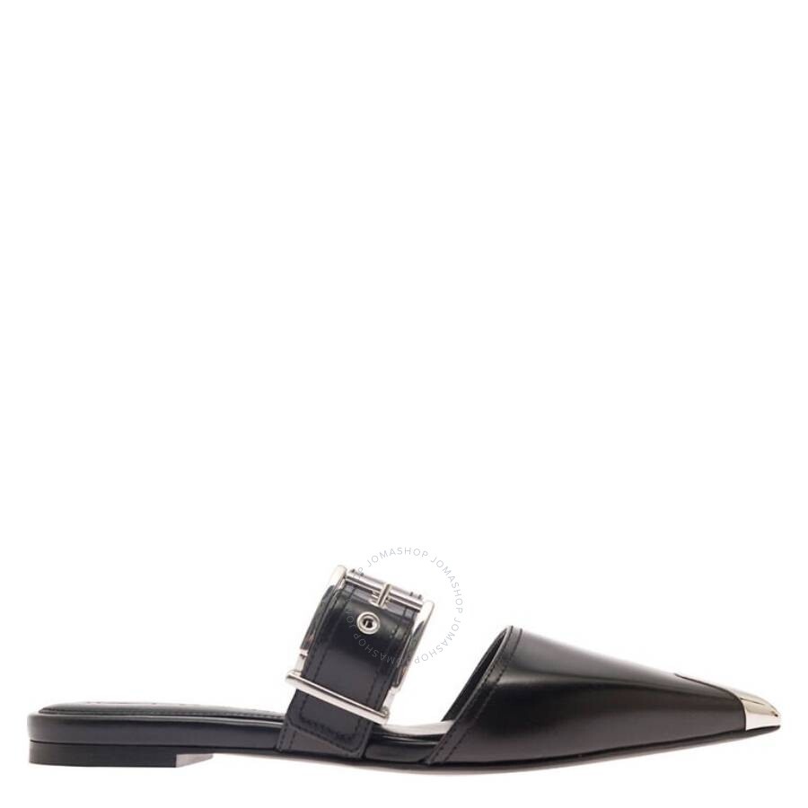 Alexander McQueen Ladies Shoes. SKU: 733188 WHSWD 1081. Color: Black/Silver. Smooth grain leather with a pointed toe and two buckle-fastening straps, featuring a metallic toe cap detail. Made in Italy. Please visit the brand website for sizing information. GENERAL Brand Type: Designer INFORMATION Brand: Alexander Mcqueen Model: 733188 WHSWD 1081 Gender: Womens DETAILS Category: Flats Color: Black/Silver ADDITIONAL INFO Jomashop Sku: -733188WHSWD1081 Department: Shoes