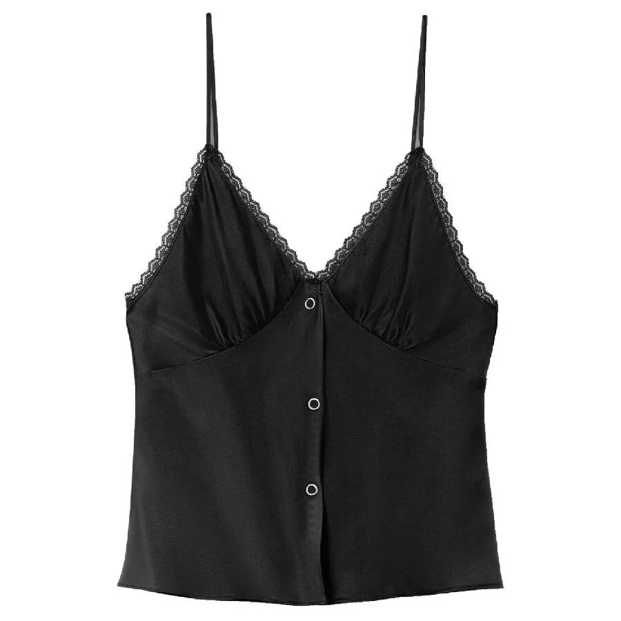 Alexander Wang Ladies Tops. SKU: 1WC2251086. Color: Black. Alexander Wang Snap Front Lace Tank Top. This tank top features a front press-stud fastening, spaghetti straps, triangle cups, and delicate lace trim for a feminine and adjustable fit. 100% Silk. GENERAL Color: Black INFORMATION Brand: Alexander Wang Gender: Womens Model: 1WC2251086-BLACK DETAILS Category: Tops Apparel Type: Tank Tops Material: Silk ADDITIONAL INFO Jomashop Sku: -1WC2251086BLACK Department: Clothing