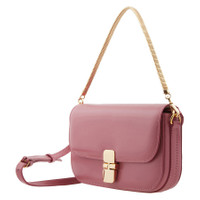 A.P.C. Ladies Clutch. SKU: PXBMW-F61882. Color: Rose. Size: 7.9 x 4.5 x 1.2". A.P.C. Grace Leather Chain Clutch Bag. This leather bag, inspired by chic vintage clutch designs, offers versatile styling with its adjustable leather shoulder strap that allows it to be worn on the shoulder or across the chest. For a more elegant touch, it also features a goldtone chain handle for hand carry. The bag closes with a leather tab and goldtone hardware clasp, adding a refined finish. Inside, it includes one spacious compartment and four card slots for organization. Two goldtone rings on the sides enhance the detailing, while the back is subtly embossed with the signature goldtone 'A.P.C. Rue Madame Paris' logo. 100% cowhide leather. Made in Morocco. GENERAL Size Info: 7.9 x 4.5 x 1.2" Color: Rose INFORMATION Brand: A.P.C. Gender: Womens Model: PXBMW-F61882-ROSE DETAILS Material: Leather ADDITIONAL INFO UPC Code: 3613061626859 Jomashop Sku: Z-9YLD5 Department: Bags Category: Clutches