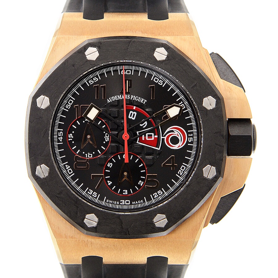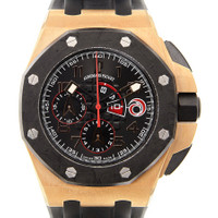 18kt rose gold case with a black rubber strap. 8 screws fixed black bezel. Black dial with luminous hands and Arabic hour markers. Minute markers around the outer rim. Dial Type: Analog. Luminescent hands and markers. Date display at the 3 o'clock position. Chronograph - three sub-dials displaying: 20 minute chronograph, 10 minute countdown and 6 hour. Audemars Piguet Calibre 2326/2848 Automatic movement, containing 50 Jewels, bitting at 28800 vph, and has a power reserve of approximately 60 hours. Scratch resistant sapphire crystal. Screw down crown. Solid case back. Octagon case shape, case size: 44 mm, case thickness: 14.3 mm. Deployment clasp. Water resistant at 100 meters / 330 feet. Functions: chronograph, flyback, rattrapante, hour, minute, small second. Royal Oak Offshore Alinghi Team Series. Luxury watch style. Watch label: Swiss Made. Item Variations: 26062OR OO A002CA 01, 26062OR-OO-A002CA-01, 26062OROOA002CA01. Audemars Piguet Black Dial Chronograph 18kt Rose Gold Black Rubber Men's Watch 26062OROOA002CA01. GENERAL Color: Black / Gold / Rose CASE Case Size: 44 Case Thickness: 14.3 mm Case Material: 18kt Rose Gold Case Shape: Octagon Case Back: Solid BAND Band Material: Rubber Band Type: Strap Band Color: Black Clasp: Deployment DIAL Dial Color: Black Type: Analog Crystal: Scratch Resistant Sapphire Hands: Luminous Dial Markers: Arabic Second Markers: Minute Markers around the outer rim Sub Dials: Three - 20 minute chronograph, 10 minute countdown and 6 Hour Luminiscence: Hands and Markers Bezel: 8 Screws Fixed Bezel Color: Black Crown: Screw Down INFORMATION Brand: Audemars Piguet Series: Royal Oak Offshore Alinghi Team Collection Name: Royal Oak Offshore Alinghi Team Gender: Mens Model: 26062OR.OO.A002CA.01 Watch Label: Swiss Made Movement: Automatic Engine: Audemars Piguet Calibre 2326/2848 Power Reserve: 40 hours FEATURES Water Resistance: 100 meters / 330 feet Calendar: Date display at the 3 o'clock position Functions: Chronograph, FlyBack, Rattrapante, Hour, Minute, Small Second Watch Features: Analog, Rattrapante, Flyback, Gold, Rubber, Chronograph ADDITIONAL INFO Watch Style: Luxury Warranty: 2 Year Jomashop Warranty Jomashop Sku: AP26062OROOA002CA01 Item Variation: 26062OR OO A002CA 01, 26062OR-OO-A002CA-01, 26062OROOA002CA01 Department: Watches Category: Watches