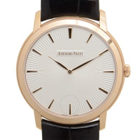 18kt rose gold case with a black alligator leather strap. Fixed bezel. Ivory dial with gold-toned hands and index hour markers. Dial Type: Analog. Automatic movement. Scratch resistant sapphire crystal. Pull / push crown. Case diameter: 41 mm. Case thickness: 6.7 mm. Round case shape. Folding clasp. Water resistant at 20 meters / 66 feet. Functions: hour, minute. Luxury watch style. Watch label: Swiss Made. Audemars Piguet Jules Audemars Ivory Dial Black Leather Men's Watch 15180OR.OO.A102CR.01. CASE Case Size: 41 Case Thickness: 6.7 mm Case Material: 18kt Rose Gold Case Shape: Round Case Back: Skeleton BAND Band Material: Alligator Leather Band Type: Strap Band Color: Black Clasp: Fold Over DIAL Dial Color: Ivory Type: Analog Crystal: Scratch Resistant Sapphire Hands: Gold-toned Dial Markers: Index Bezel: Fixed Bezel Material: 18kt Rose Gold Crown: Pull / Push INFORMATION Brand: Audemars Piguet Series: Jules Audemars Collection Name: Jules Audemars Gender: Mens Model: 15180OR.OO.A102CR.01 Watch Label: Swiss Made Movement: Automatic Engine: Audemars Piguet Calibre 2120 Power Reserve: 40 hours FEATURES Water Resistance: 20 meters / 65 feet Functions: Hour, Minute Watch Features: Leather, Gold, Analog, Alligator Leather ADDITIONAL INFO Watch Style: Luxury Warranty: 2 Year Jomashop Warranty Jomashop Sku: AP15180OROOA102CR01 Item Variation: 15180OR OO A102CR 01, 15180OR-OO-A102CR-01, 15180OROOA102CR01 Department: Watches Category: Watches
