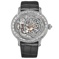 18kt white gold case with a grey alligator leather strap. Fixed 18kt white gold bezel with diamond set. Sapphire dial with pink gold hands and Arabic numeral hour markers. Dial Type: Analog. One subdial displaying: tourbillon. Audemars Piguet Calibre 2940 Hand Wind movement, containing 19 Jewels, composed of 190 parts, bitting at 21600 vph, and has a power reserve of approximately 72 hours. Scratch resistant sapphire crystal. Oval case shape, case size: 45 mm, case thickness: 11.7 mm. Deployment buckle clasp. Water resistant at 200 meters / 660 feet. Functions: hour, minute, tourbillon. Additional Info: case and buckle set with 205 baguette-cut diamonds (~10.52 carats), rings set with 86 baguette-cut diamonds (~0.68 carats) movement set with 92 baguet. Millenary Tourbillon Series. Luxury watch style. Watch label: Swiss Made. Audemars Piguet Millenary Tourbillon Sapphire Dial Men's Hand Wind Wach 26381BC.ZZ.D113CR.01. CASE Case Size: 45 mm Case Thickness: 11.7 mm Case Material: 18kt White Gold Case Shape: Oval BAND Band Material: Alligator Leather Band Type: Strap Band Color: Grey Clasp: Deployment Buckle DIAL Dial Color: Sapphire Type: Analog Crystal: Scratch Resistant Sapphire Hands: Pink Gold Dial Markers: Arabic Numeral Sub Dials: One - Tourbillon Bezel: Fixed Bezel Color: 18kt White Gold Bezel Material: Diamond Set INFORMATION Brand: Audemars Piguet Series: Millenary Tourbillon Collection Name: Millenary Tourbillon Gender: Mens Model: 26381BC.ZZ.D113CR.01 Watch Label: Swiss Made Movement: Hand Wind Engine: Audemars Piguet Calibre 2940 Power Reserve: 72 hours FEATURES Water Resistance: 200 meters / 660 feet Functions: Hour, Minute, Tourbillon Watch Features: Alligator Leather, Analog, Gold, Leather, Diamond, Tourbillon ADDITIONAL INFO Watch Style: Luxury Warranty: 2 Year Jomashop Warranty Additional Info: Case and buckle set with 205 baguette-cut diamonds (~10.52 carats), rings set with 86 baguette-cut diamonds (~0.68 carats) movement set with 92 baguet Jomashop Sku: AP26381BCZZD113CR01 Department: Watches Category: Watches