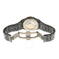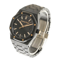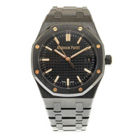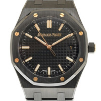 Black ceramic case and bracelet. Fixed black ceramic bezel. Black dial with rose gold-tone hands and index hour markers. Minute markers around the outer rim. Dial Type: Analog. Luminescent hands and markers. Date display at the 3 o'clock position. Audemars Piguet Calibre 5800 Automatic movement, containing 28 Jewels, composed of 189 parts, bitting at 28800 vph, and has a power reserve of approximately 50 hours. Scratch resistant sapphire crystal. Transparent see through case back. Round case shape, case size: 34 mm, case thickness: 8.8 mm. Fold over clasp with a safety release. Water resistant at 50 meters / 165 feet. Functions: date, hour, minute, second. Royal Oak Series. Luxury watch style. Watch label: Swiss Made. Audemars Piguet Royal Oak Automatic Black Dial Ladies Watch 77350CE.OO.1266CE.03. CASE Case Size: 34 Case Thickness: 8.8 mm Case Material: Ceramic Case Shape: Round Case Back: Transparent See Through BAND Band Material: Ceramic Band Type: Bracelet Band Color: Black Clasp: Fold Over with Safety Release DIAL Dial Color: Black Type: Analog Crystal: Scratch Resistant Sapphire Hands: Rose Gold-tone Dial Markers: Index Second Markers: Minute Markers around the outer rim Luminiscence: Hands and Markers Bezel: Fixed Bezel Color: Black Bezel Material: Ceramic INFORMATION Brand: Audemars Piguet Series: Royal Oak Collection Name: Royal Oak Gender: Womens Model: 77350CE.OO.1266CE.03 Watch Label: Swiss Made Movement: Automatic Engine: Audemars Piguet Calibre 5800 Power Reserve: 50 hours FEATURES Water Resistance: 50 meters / 165 feet Calendar: Date display at the 3 o'clock position Functions: Date, Hour, Minute, Second Watch Features: Gold, Ceramic, Analog ADDITIONAL INFO Watch Style: Luxury Warranty: 2 Year Jomashop Warranty Jomashop Sku: AP77350CEOO1266CE03 Department: Watches