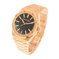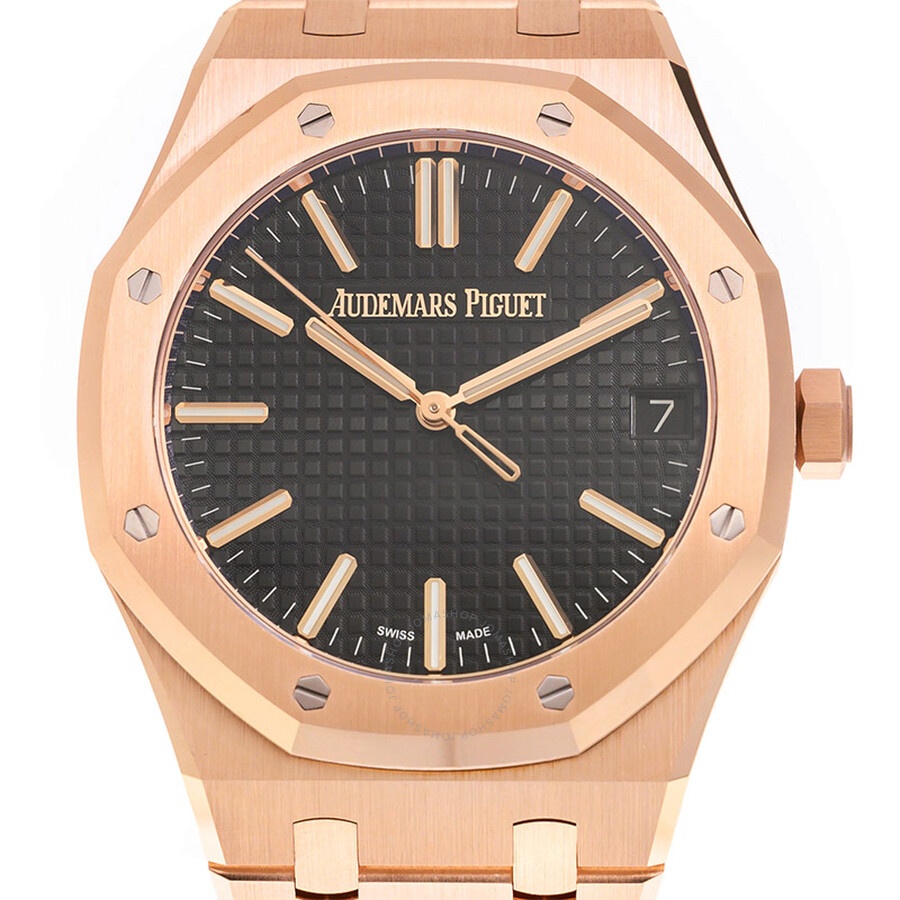 Rose gold-tone 18kt rose gold case and bracelet. Fixed rose gold-tone 18kt rose gold bezel. Black dial with rose gold-tone hands and index hour markers. Minute markers around the outer rim. Dial Type: Analog. Luminescent hands and markers. Date display at the 3 o'clock position. Audemars Piguet Calibre 4302 Automatic movement, containing 32 Jewels, bitting at 28800 vph, and has a power reserve of approximately 70 hours. Scratch resistant sapphire crystal. Screw down crown. Round case shape, case size: 41 mm, case thickness: 10.5 mm. Fold over clasp with a safety release. Water resistant at 50 meters / 165 feet. Functions: date, hour, minute, second. Additional Info: original box, manual (complete accessories). Royal Oak Series. Luxury watch style. Watch label: Swiss Made. Audemars Piguet Royal Oak Automatic Black Dial Men's Watch 15510OR.OO.1320OR.04. CASE Case Size: 41 Case Thickness: 10.5 mm Case Material: 18kt Rose Gold Case Shape: Round BAND Band Material: 18kt Rose Gold Band Type: Bracelet Band Color: Rose Gold-tone Clasp: Fold Over with Safety Release DIAL Dial Color: Black Type: Analog Crystal: Scratch Resistant Sapphire Hands: Rose Gold-tone Dial Markers: Index Second Markers: Minute Markers around the outer rim Luminiscence: Hands and Markers Bezel: Fixed Bezel Color: Rose Gold-tone Bezel Material: 18kt Rose Gold Crown: Screw Down INFORMATION Brand: Audemars Piguet Series: Royal Oak Collection Name: Royal Oak Gender: Mens Model: 15510OR.OO.1320OR.04 Watch Label: Swiss Made Movement: Automatic Engine: Audemars Piguet Calibre 4302 Power Reserve: 70 hours FEATURES Water Resistance: 50 meters / 165 feet Calendar: Date display at the 3 o'clock position Functions: Date, Hour, Minute, Second Watch Features: Gold, Analog ADDITIONAL INFO Watch Style: Luxury Warranty: 2 Year Jomashop Warranty Additional Info: Original Box, Manual (Complete Accessories) Jomashop Sku: AP15510OROO1320OR04 Department: Watches Category: Watches