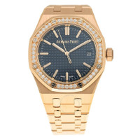 Rose gold-tone 18kt rose gold case and bracelet. Fixed rose gold-tone bezel with diamond set 18kt rose gold. Blue dial with rose gold-tone hands and index hour markers. Minute markers around the outer rim. Dial Type: Analog. Luminescent hands and markers. Date display at the 3 o'clock position. Audemars Piguet Calibre 5900 automatic movement with a 60-hour power reserve. Scratch resistant sapphire crystal. Screw down crown. Transparent see through case back. Octagon case shape, case size: 37 mm, case thickness: 9 mm. Deployment with push button release clasp. Water resistant at 50 meters / 165 feet. Functions: date, hour, minute, second. Additional Info: 40 brilliant-cut diamonds; ~0.92 carat (bezel). Royal Oak Series. Luxury watch style. Watch label: Swiss Made. Audemars Piguet Royal Oak Automatic Diamond Blue Dial Ladies Watch 15551OR.ZZ.1356OR.02. INFORMATION Brand: Audemars Piguet Series: Royal Oak Collection Name: Royal Oak Gender: Womens Model: 15551OR.ZZ.1356OR.02 Watch Label: Swiss Made Movement: Automatic Engine: Audemars Piguet Calibre 5900 Power Reserve: 60 hours CASE Case Size: 37 mm Case Thickness: 9 mm Case Material: 18kt Rose Gold Case Shape: Octagon Case Back: Transparent See Through BAND Band Material: 18kt Rose Gold Band Type: Bracelet Band Color: Rose Gold-tone Clasp: Deployment with Push Button Release DIAL Dial Color: Blue Type: Analog Crystal: Scratch Resistant Sapphire Hands: Rose Gold-tone Dial Markers: Index Second Markers: Minute Markers around the outer rim Luminiscence: Hands and Markers Bezel: Fixed Bezel Color: Rose Gold-tone Bezel Material: Diamond Set 18kt Rose Gold Crown: Screw Down FEATURES Water Resistance: 50 meters / 165 feet Calendar: Date display at the 3 o'clock position Functions: Date, Hour, Minute, Second Watch Features: Diamond, Gold, Analog ADDITIONAL INFO Watch Style: Luxury Warranty: 2 Year Jomashop Warranty Additional Info: 40 brilliant-cut diamonds; ~0.92 carat (bezel) Jomashop Sku: AP15551ORZZ1356OR02 Department: Watches Category: Watches