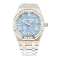 Silver-tone stainless steel case and bracelet. Fixed silver-tone bezel with diamond set stainless steel. Blue dial with silver-tone hands and index hour markers. Minute markers around the outer rim. Dial Type: Analog. Luminescent hands and markers. Date display at the 3 o'clock position. Audemars Piguet Calibre 5800 Automatic movement, containing 28 Jewels, composed of 189 parts, bitting at 28800 vph, and has a power reserve of approximately 50 hours. Scratch resistant sapphire crystal. Transparent see through case back. Round case shape, case size: 34 mm, case thickness: 8.8 mm. Fold over clasp with a safety release. Water resistant at 50 meters / 165 feet. Functions: date, hour, minute, second. Additional Info: original box, international warranty card, manual (complete accessories). Royal Oak Series. Luxury watch style. Watch label: Swiss Made. Audemars Piguet Royal Oak Automatic Diamond Blue Dial Ladies Watch 77451ST.ZZ.1361ST.03. INFORMATION Brand: Audemars Piguet Series: Royal Oak Collection Name: Royal Oak Gender: Womens Model: 77451ST.ZZ.1361ST.03 Watch Label: Swiss Made Movement: Automatic Engine: Audemars Piguet Calibre 5800 Power Reserve: 50 hours CASE Case Size: 34 mm Case Thickness: 8.8 mm Case Material: Stainless Steel Case Shape: Round Case Back: Transparent See Through BAND Band Material: Stainless Steel Band Type: Bracelet Band Color: Silver-tone Clasp: Fold Over with Safety Release DIAL Dial Color: Blue Type: Analog Crystal: Scratch Resistant Sapphire Hands: Silver-tone Dial Markers: Index Second Markers: Minute Markers around the outer rim Luminiscence: Hands and Markers Bezel: Fixed Bezel Color: Silver-tone Bezel Material: Diamond Set Stainless Steel FEATURES Water Resistance: 50 meters / 165 feet Calendar: Date display at the 3 o'clock position Functions: Date, Hour, Minute, Second Watch Features: Diamond, Stainless Steel, Analog ADDITIONAL INFO Watch Style: Luxury Warranty: 2 Year Jomashop Warranty Additional Info: Original Box, International Warranty Card, Manual (Complete Accessories) Jomashop Sku: AP77451STZZ1361ST03 Department: Watches Category: Watches