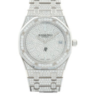 18kt white gold case with a diamond set 18kt white gold bracelet. Fixed bezel with diamond set 18kt white gold. Silver-tone dial with silver-tone hands and index hour markers. Dial Type: Analog. Luminescent hands and markers. Date display at the 3 o'clock position. Audemars Piguet Calibre 7121 automatic movement with a 52-hour power reserve. Scratch resistant sapphire crystal. Transparent see through case back. Round case shape, case size: 39 mm, case thickness: 8.1 mm. Fold over clasp with a safety release. Water resistant at 20 meters / 66 feet. Functions: date, hour, minute. Additional Info: original box, international warranty card, manual (complete accessories). Royal Oak Series. Luxury watch style. Watch label: Swiss Made. Audemars Piguet Royal Oak Automatic Diamond Silver Dial Men's Watch 16202BC.ZZ.1241BC.01. CASE Case Size: 39 Case Thickness: 8.1 mm Case Material: 18kt White Gold Case Shape: Round Case Back: Transparent See Through BAND Band Material: Diamond Set 18kt White Gold Band Type: Bracelet Clasp: Fold Over with Safety Release DIAL Dial Color: Silver-tone Type: Analog Crystal: Scratch Resistant Sapphire Hands: Silver-tone Dial Markers: Index Luminiscence: Hands and Markers Bezel: Fixed Bezel Material: Diamond Set 18kt White Gold INFORMATION Brand: Audemars Piguet Series: Royal Oak Collection Name: Royal Oak Gender: Mens Model: 16202BC.ZZ.1241BC.01 Watch Label: Swiss Made Movement: Automatic Engine: Audemars Piguet Calibre 7121 Power Reserve: 52 hours FEATURES Water Resistance: 20 meters / 66 feet Calendar: Date display at the 3 o'clock position Functions: Date, Hour, Minute Watch Features: Diamond, Gold, Analog ADDITIONAL INFO Watch Style: Luxury Warranty: 2 Year Jomashop Warranty Additional Info: Original Box, Manual (Complete Accessories) Jomashop Sku: AP16202BCZZ1241BC01 Department: Watches