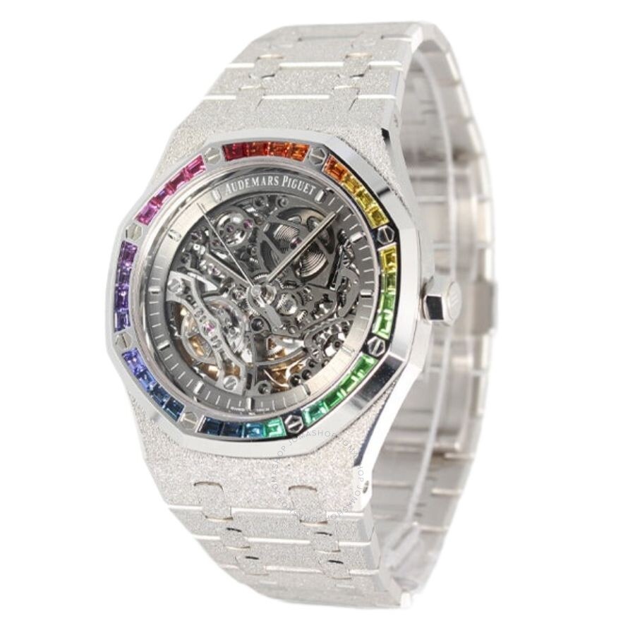 Frosted 18kt white gold case and bracelet. Fixed rainbow set with baguette-cut multicoloured gemstones bezel. Transparent dial with silver-tone hands and index hour markers. Minute markers around the outer rim. Dial Type: Analog. Luminescent hands and markers. Audemars Piguet Calibre 3132 Automatic movement, based upon Audemars Piguet AP 3120, containing 38 Jewels, bitting at 21600 vph, and has a power reserve of approximately 45 hours. Scratch resistant sapphire crystal. Screw down crown. Transparent see through case back. Round case shape, case size: 41 mm, case thickness: 10.1 mm. Fold over clasp with a safety release. Water resistant at 50 meters / 165 feet. Functions: hour, minute, second. Additional Info: original box, manual (complete accessories). Royal Oak Series. Luxury watch style. Watch label: Swiss Made. Audemars Piguet Royal Oak Automatic Men's Watch 15412BC.YG.1224BC.03. CASE Case Size: 41 Case Thickness: 10.1 mm Case Material: Frosted 18kt White Gold Case Shape: Round Case Back: Transparent See Through BAND Band Material: Frosted 18kt White Gold Band Type: Bracelet Clasp: Fold Over with Safety Release DIAL Dial Color: Transparent Type: Analog Crystal: Scratch Resistant Sapphire Hands: Silver-tone Dial Markers: Index Second Markers: Minute Markers around the outer rim Luminiscence: Hands and Markers Bezel: Fixed Bezel Material: Rainbow Set With Baguette-Cut Multicoloured Gemstones Crown: Screw Down INFORMATION Brand: Audemars Piguet Series: Royal Oak Collection Name: Royal Oak Gender: Mens Model: 15412BC.YG.1224BC.03 Watch Label: Swiss Made Movement: Automatic Engine: Audemars Piguet Calibre 3132 Power Reserve: 45 hours FEATURES Water Resistance: 50 meters / 165 feet Functions: Hour, Minute, Second Watch Features: Gold, Analog ADDITIONAL INFO Watch Style: Luxury Warranty: 2 Year Jomashop Warranty Additional Info: Original Box, Manual (Complete Accessories) Jomashop Sku: AP15412BCYG1224BC03 Department: Watches Category: Watches