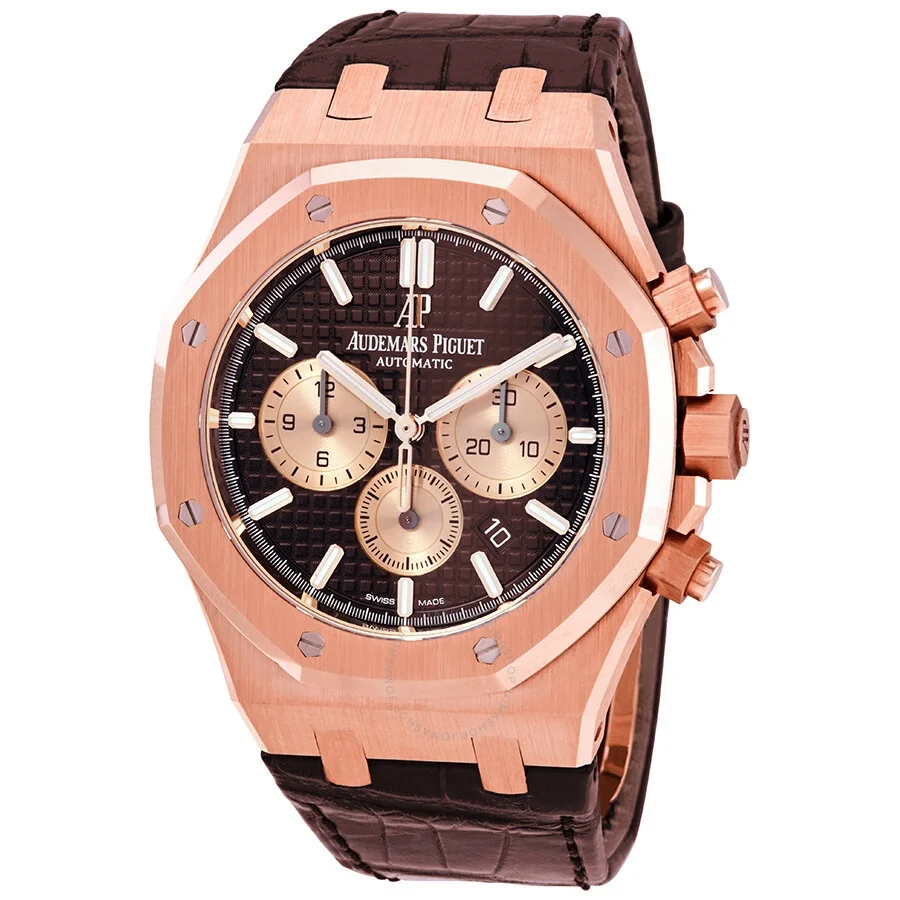 18kt rose gold case with a brown alligator leather strap. 8 screws fixed 18kt rose gold bezel. Brown grande tapisserie dial with rose gold-tone hands and index hour markers. Minute markers around the outer rim. Dial Type: Analog. Date display between 4 and 5 o'clock position. Chronograph - three sub-dials displaying: 60 second, 30 minute and 12 hours. Audemars Piguet Calibre 2385 Automatic movement, containing 37 Jewels, composed of 304 parts, bitting at 21600 vph, and has a power reserve of approximately 40 hours. Scratch resistant sapphire crystal. Screw down crown. Octagon case shape, case size: 41 mm, case thickness: 11 mm. Water resistant at 50 meters / 165 feet. Functions: chronograph, date, hour, minute, second. Luxury watch style. Watch label: Swiss Made. Audemars Piguet Royal Oak Brown Dial Automatic Men's Watch 26331OR.OO.D821CR.01. CASE Case Size: 41 mm Case Thickness: 11 mm Case Material: 18kt Rose Gold Case Shape: Octagon BAND Band Material: Alligator Leather Band Type: Strap Band Color: Brown DIAL Dial Color: Brown Grande Tapisserie Type: Analog Crystal: Scratch Resistant Sapphire Hands: Rose Gold-tone Dial Markers: Index Second Markers: Minute Markers around the outer rim Sub Dials: Three - 60 Second, 30 Minute and 12 Hour Bezel: 8 Screws Fixed Bezel Material: 18kt Rose Gold Crown: Screw Down INFORMATION Brand: Audemars Piguet Series: Royal Oak Collection Name: Royal Oak Gender: Mens Model: 26331OR.OO.D821CR.01 Watch Label: Swiss Made Movement: Automatic Engine: Audemars Piguet Calibre 2385 Power Reserve: 40 hours FEATURES Water Resistance: 50 meters / 165 feet Calendar: Date display between 4 and 5 o'clock position Functions: Chronograph, Date, Hour, Minute, Second Watch Features: Chronograph, Leather, Gold, Analog, Alligator Leather ADDITIONAL INFO Watch Style: Luxury Warranty: 2 Year Jomashop Warranty Jomashop Sku: AP26331OROOD821CR01 Department: Watches Category: Watches