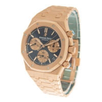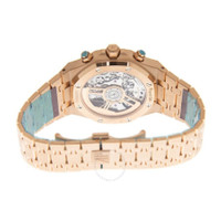 Rose gold-tone 18kt rose gold case and bracelet. Fixed rose gold-tone 18kt rose gold bezel. Blue dial with rose gold-tone hands and index hour markers. Minute markers around the outer rim. Dial Type: Analog. Luminescent hands and markers. Date display between 4 and 5 o'clock position. Chronograph - three sub-dials displaying: 60 second, 30 minute and 12 hour. Audemars Piguet Calibre 4401 Automatic movement, containing 40 Jewels, composed of 367 parts, bitting at 28800 vph, and has a power reserve of approximately 70 hours. Scratch resistant sapphire crystal. Screw down crown. Transparent see through case back. Octagon case shape, case size: 41 mm, case thickness: 12.38 mm. Deployment with push button release clasp. Water resistant at 50 meters / 165 feet. Functions: chronograph, column wheel, flyback, date, hour, minute, second. Additional Info: original box, international warranty card, manual (complete accessories). Royal Oak Series. Luxury watch style. Watch label: Swiss Made. Audemars Piguet Royal Oak Chronograph Automatic Blue Dial Men's Watch 26239OR.OO.1220OR.01. CASE Case Size: 41 Case Thickness: 12.38 mm Case Material: 18kt Rose Gold Case Shape: Octagon Case Back: Transparent See Through BAND Band Material: 18kt Rose Gold Band Type: Bracelet Band Color: Rose Gold-tone Clasp: Deployment with Push Button Release DIAL Dial Color: Blue Type: Analog Crystal: Scratch Resistant Sapphire Hands: Rose Gold-tone Dial Markers: Index Second Markers: Minute Markers around the outer rim Sub Dials: Three - 60 Second, 30 Minute and 12 Hour Luminiscence: Hands and Markers Bezel: Fixed Bezel Color: Rose Gold-tone Bezel Material: 18kt Rose Gold Crown: Screw Down INFORMATION Brand: Audemars Piguet Series: Royal Oak Collection Name: Royal Oak Gender: Mens Model: 26239OR.OO.1220OR.01 Watch Label: Swiss Made Movement: Automatic Engine: Audemars Piguet Calibre 4401 Power Reserve: 70 hours FEATURES Water Resistance: 50 meters / 165 feet Calendar: Date display between 4 and 5 o'clock position Functions: Chronograph, Column Wheel, FlyBack, Date, Hour, Minute, Second Watch Features: Chronograph, Gold, Flyback, Analog ADDITIONAL INFO Watch Style: Luxury Warranty: 2 Year Jomashop Warranty Additional Info: Original Box, Manual (Complete Accessories) Jomashop Sku: AP26239OROO1220OR01 Department: Watches Category: Watches