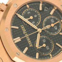 Rose gold-tone 18kt rose gold case with a green alligator band. Fixed rose gold-tone 18kt rose gold bezel. Green dial with rose gold-tone hands and index hour markers. Minute markers around the outer rim. Dial Type: Analog. Luminescent hands and markers. Date display between 4 and 5 o'clock position. Chronograph - three sub-dials displaying: 60 second, 30 minute and 12 hour. Audemars Piguet Calibre 4401 Automatic movement, containing 40 Jewels, composed of 367 parts, bitting at 28800 vph, and has a power reserve of approximately 70 hours. Scratch resistant sapphire crystal. Screw down crown. Transparent see through case back. Octagon case shape, case size: 41 mm. Buckle clasp. Water resistant at 50 meters / 165 feet. Functions: chronograph, column wheel, flyback, date, hour, minute, second. Additional Info: original box, international warranty card, manual (complete accessories). Royal Oak Series. Luxury watch style. Watch label: Swiss Made. Audemars Piguet Royal Oak Chronograph Automat INFORMATION Brand: Audemars Piguet Series: Royal Oak Collection Name: Royal Oak Gender: Mens Model: 26240OR.OO.D404CR.01 Watch Label: Swiss Made Movement: Automatic Engine: Audemars Piguet Calibre 4401 Power Reserve: 70 hours CASE Case Size: 41 mm Case Material: 18kt Rose Gold Case Shape: Octagon Case Back: Transparent See Through BAND Band Material: Alligator Band Type: Strap Band Color: Green Clasp: Buckle DIAL Dial Color: Green Type: Analog Crystal: Scratch Resistant Sapphire Hands: Rose Gold-tone Dial Markers: Index Second Markers: Minute Markers around the outer rim Sub Dials: Three - 60 Second, 30 Minute and 12 Hour Luminiscence: Hands and Markers Bezel: Fixed Bezel Color: Rose Gold-tone Bezel Material: 18kt Rose Gold Crown: Screw Down FEATURES Water Resistance: 50 meters / 165 feet Calendar: Date display between 4 and 5 o'clock position Functions: Chronograph, Column Wheel, FlyBack, Date, Hour, Minute, Second Watch Features: Chronograph, Gold, Flyback, Analog, Alligator Leather ADDITIONAL INFO Watch Style: Luxury Warranty: 2 Year Jomashop Warranty Additional Info: Original Box, International Warranty Card, Manual (Complete Accessories) Jomashop Sku: AP26240OROOD404CR01 Department: Watches Category: Watches