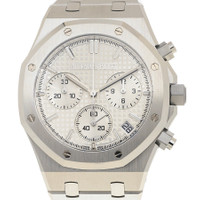 Silver-tone stainless steel case and bracelet. Fixed silver-tone stainless steel bezel. Silver-tone dial with silver-tone hands and index hour markers. Minute markers around the outer rim. Dial Type: Analog. Luminescent hands and markers. Date display between 4 and 5 o'clock position. Chronograph - three sub-dials displaying: 60 second, 30 minute and 12 hour. Audemars Piguet Calibre 4401 Automatic movement, containing 40 Jewels, composed of 367 parts, bitting at 28800 vph, and has a power reserve of approximately 70 hours. Scratch resistant sapphire crystal. Screw down crown. Transparent see through case back. Round case shape, case size: 41 mm, case thickness: 12.4 mm. Fold over clasp with a safety release. Water resistant at 50 meters / 165 feet. Functions: chronograph, column wheel, flyback, date, hour, minute, second. Additional Info: original box, international warranty card, manual (complete accessories). Royal Oak Series. Luxury watch style. Watch label: Swiss Made. Audemars Piguet Royal Oak Chronograph Automatic Silver Dial Men's Watch 26240ST.OO.1320ST.07. CASE Case Size: 41 mm Case Thickness: 12.4 mm Case Material: Stainless Steel Case Shape: Round Case Back: Transparent See Through BAND Band Material: Stainless Steel Band Type: Bracelet Band Color: Silver-tone Clasp: Fold Over with Safety Release DIAL Dial Color: Silver-tone Type: Analog Crystal: Scratch Resistant Sapphire Hands: Silver-tone Dial Markers: Index Second Markers: Minute Markers around the outer rim Sub Dials: Three - 60 Second, 30 Minute and 12 Hour Luminiscence: Hands and Markers Bezel: Fixed Bezel Color: Silver-tone Bezel Material: Stainless Steel Crown: Screw Down INFORMATION Brand: Audemars Piguet Series: Royal Oak Collection Name: Royal Oak Gender: Mens Model: 26240ST.OO.1320ST.07 Watch Label: Swiss Made Movement: Automatic Engine: Audemars Piguet Calibre 4401 Power Reserve: 70 hours FEATURES Water Resistance: 50 meters / 165 feet Calendar: Date display between 4 and 5 o'clock position Functions: Chronograph, Column Wheel, FlyBack, Date, Hour, Minute, Second Watch Features: Chronograph, Stainless Steel, Flyback, Analog ADDITIONAL INFO Watch Style: Luxury Warranty: 2 Year Jomashop Warranty Additional Info: Original Box, International Warranty Card, Manual (Complete Accessories) Jomashop Sku: AP26240STOO1320ST07 Department: Watches Category: Watches