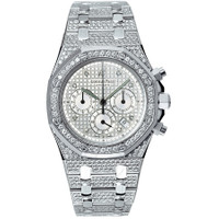 18kt white gold case set with diamonds case with a white gold-tone 18kt white gold bracelet set with diamonds bracelet. Fixed 18kt white gold diamond set bezel. Silver grande tapisserie dial with luminous hands and diamond hour markers. Minute markers around the outer rim. Dial Type: Analog. Luminescent hands. Date display between 4 and 5 o'clock position. Chronograph - three sub-dials displaying: 60 second, 30 minute and 12 hour. Audemars Piguet Calibre 2385 Automatic movement, containing 37 Jewels, composed of 304 parts, bitting at 21600 vph, and has a power reserve of approximately 40 hours. Scratch resistant sapphire crystal. Screw down crown. Solid case back. Octagon case shape, case size: 39 mm, case thickness: 11 mm. Deployment with push button release clasp. Water resistant at 50 meters / 165 feet. Functions: chronograph, column wheel, date, hour, minute, small second. Royal Oak Series. Luxury watch style. Watch label: Swiss Made. Item Variations: 25967BC ZZ 1185BC 01, 25967BC-ZZ-1185BC-01, 25967BCZZ1185BC01. Audemars Piguet Royal Oak Chronograph Diamond White Gold Men's Watch 25967BC.ZZ.1185BC.01. GENERAL Color: Gold / Silver / White CASE Case Size: 39 Case Thickness: 11 mm Case Material: 18kt white gold case set with diamonds Case Shape: Octagon Case Back: Solid BAND Band Material: 18kt White Gold bracelet set with diamonds Band Type: Bracelet Band Color: White Gold-tone Clasp: Deployment with Push Button Release DIAL Dial Color: Silver Grande Tapisserie Type: Analog Crystal: Scratch Resistant Sapphire Hands: Luminous Dial Markers: Diamond Second Markers: Minute Markers around the outer rim Sub Dials: Three - 60 Second, 30 Minute and 12 Hour Luminiscence: Hands Bezel: Fixed Bezel Color: 18kt white gold Bezel Material: Diamond Set Crown: Screw Down INFORMATION Brand: Audemars Piguet Series: Royal Oak Collection Name: Royal Oak Gender: Mens Model: 25967BC.ZZ.1185BC.01 Watch Label: Swiss Made Movement: Automatic Engine: Audemars Piguet Calibre 2385 Power Reserve: 40 hours FEATURES Water Resistance: 50 meters / 165 feet Calendar: Date display between 4 and 5 o'clock position Functions: Chronograph, Column Wheel, Date, Hour, Minute, Small Second Watch Features: Diamond, Chronograph, Gold, Analog ADDITIONAL INFO Watch Style: Luxury Warranty: 2 Year Jomashop Warranty Jomashop Sku: AP25967BCZZ1185BC01 Item Variation: 25967BC ZZ 1185BC 01, 25967BC-ZZ-1185BC-01, 25967BCZZ1185BC01 Department: Watches Category: Watches