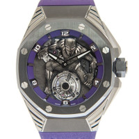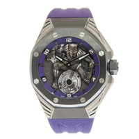 Grey titanium case with a purple rubber strap. Fixed black ceramic bezel. Silver-tone dial with black hands and Arabic numeral hour markers. Dial Type: Analog. Luminescent hands and markers. Audemars Piguet Calibre 2965 hand wind movement. Scratch resistant sapphire crystal. Transparent see through case back. Round case shape, case size: 42 mm, case thickness: 14.6 mm. Deployment with push button release clasp. Water resistant at 50 meters / 165 feet. Functions: hour, minute, flying tourbillon. Additional Info: limited edition of 250, “black panther” flying tourbillon. Royal Oak Concept Series. Luxury watch style. Watch label: Swiss Made. Audemars Piguet Royal Oak Concept “Black Panther” Tourbillon Hand Wind Silver Dial Men's Watch 26620IO.OO.D077CA.01. INFORMATION Brand: Audemars Piguet Series: Royal Oak Concept Collection Name: Royal Oak Concept Gender: Mens Model: 26620IO.OO.D077CA.01 Watch Label: Swiss Made Movement: Hand Wind Engine: Audemars Piguet Calibre 2965 CASE Case Size: 42 mm Case Thickness: 14.6 mm Case Material: Titanium Case Shape: Octagon Case Back: Transparent See Through BAND Band Material: Rubber Band Type: Strap Band Color: Purple Clasp: Deployment with Push Button Release DIAL Dial Color: Silver-tone Type: Analog Crystal: Scratch Resistant Sapphire Hands: Black Dial Markers: Arabic Numeral Luminiscence: Hands and Markers Bezel: Fixed Bezel Color: Black Bezel Material: Ceramic FEATURES Water Resistance: 50 meters / 165 feet Functions: Hour, Minute, Flying Tourbillon Watch Features: Tourbillon, Titanium, Rubber, Ceramic, Analog ADDITIONAL INFO Watch Style: Luxury Warranty: 2 Year Jomashop Warranty Additional Info: LIMITED EDITION OF 250, “BLACK PANTHER” FLYING TOURBILLON Jomashop Sku: AP26620IOOOD077CA01 Department: Watches Category: Watches