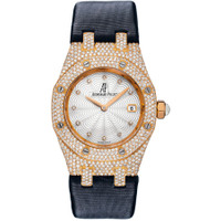 18kt rose gold case set with diamonds with a black satin strap. Fixed 18kt rose gold bezel set with diamonds. 699 brilliant-cut diamonds (4 ctw). Mother of pearl petal design dial with rose gold hands and diamond hour markers. Dial Type: Analog. Date display at the 3 o'clock position. Quartz movement. Scratch resistant sapphire crystal. Screw down crown. Solid case back. Case diameter: 33 mm. Case thickness: 9.2 mm. Octagon case shape. Deployment clasp with push button. Water resistant at 20 meters / 65 feet. Functions: date, hour, minute. Luxury watch style. Watch label: Swiss Made. Audemars Piguet Royal Oak Diamond Mother of Pearl Dial Rose Gold Ladies Watch 67605OR.ZZ.D009SU.01. GENERAL Color: Black / Gold / Mother of pearl / Rose INFORMATION Brand: Audemars Piguet Series: Royal Oak Collection Name: Royal Oak Gender: Womens Model: 67605OR.ZZ.D009SU.01 Watch Label: Swiss Made Movement: Quartz CASE Case Size: 33 mm Case Thickness: 9.2 mm Case Material: 18kt Rose Gold Case Shape: Octagon Case Back: Solid BAND Band Material: Satin Band Type: Strap Band Color: Black Clasp: Deployment with Push Button Release DIAL Dial Color: Mother of Pearl petal design Type: Analog Crystal: Scratch Resistant Sapphire Hands: Rose Gold Dial Markers: Diamond Sub Dials: 20 meters / 65 feet Bezel: Fixed 18kt Rose Gold set with Diamonds Crown: Screw Down FEATURES Water Resistance: 20 meters / 65 feet Calendar: Date display at the 3 o'clock position Functions: Date, Hour, Minute Watch Features: Diamond, Gold, Analog ADDITIONAL INFO Watch Style: Luxury Warranty: 2 Year Jomashop Warranty Jomashop Sku: AP67605ORZZD009SU01 Item Variation: 67605OR ZZ D009SU 01, 67605OR-ZZ-D009SU-01, 67605ORZZD009SU01 Department: Watches Category: Watches