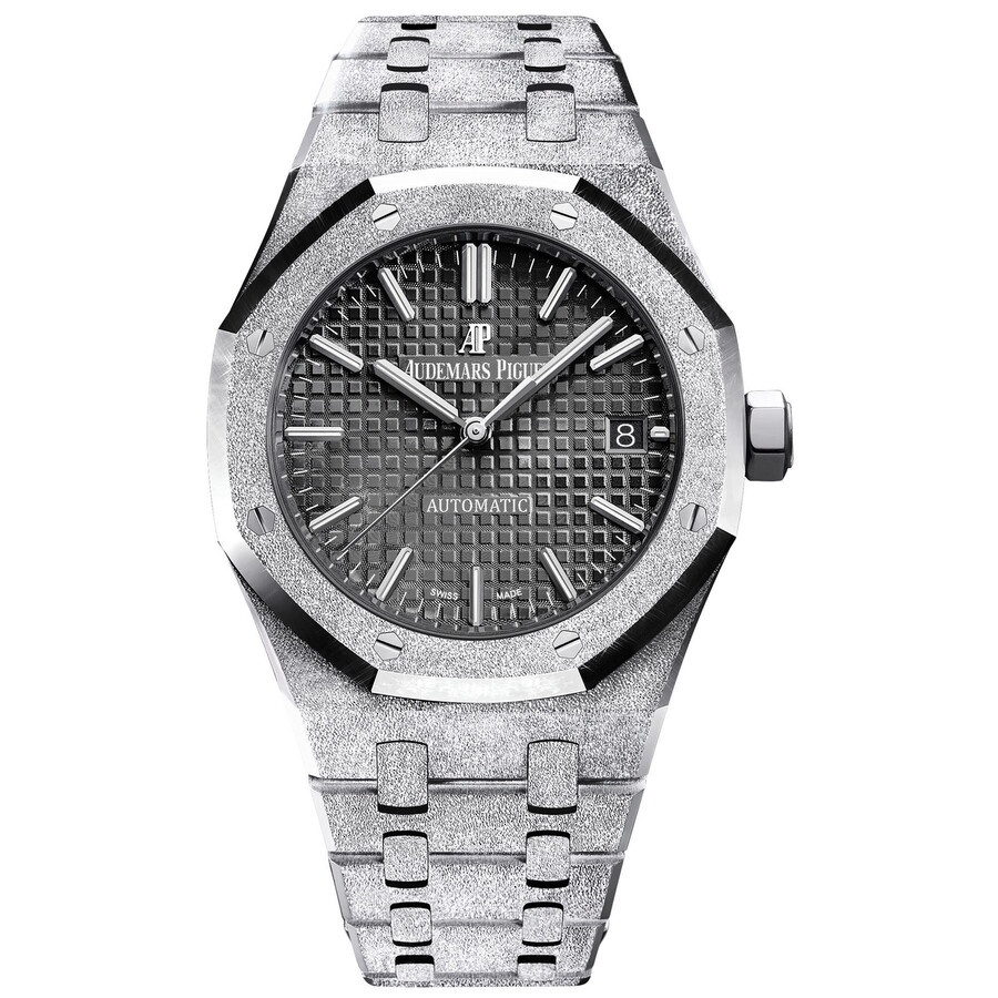18kt white gold case with a 18kt white gold bracelet. 8 screws fixed 18kt white gold bezel. Black with grande tapisserie pattern dial with silver-tone hands and index hour markers. Minute markers around the outer rim. Dial Type: Analog. Luminescent hands and markers. Date display at the o'clock position. Audemars Piguet Calibre 3120 Automatic movement, containing 40 Jewels, composed of 280 parts, bitting at 21600 vph, and has a power reserve of approximately 60 hours. Scratch resistant sapphire crystal. Screw down crown. Octagon case shape, case size: 37 mm, case thickness: 9.8 mm. Folding clasp. Water resistant at 50 meters / 165 feet. Functions: date, hour, minute. Luxury watch style. Watch label: Swiss Made. Audemars Piguet Royal Oak Frosted Gold Black Dial Ladies 18k White Gold Watch 15454BC.GG.1259BC.03. INFORMATION Brand: Audemars Piguet Series: Royal Oak Frosted Gold Collection Name: Royal Oak Frosted Gold Gender: Womens Model: 15454BC.GG.1259BC.03 Watch Label: Swiss Made Movement: Automatic Engine: Audemars Piguet Calibre 3120 Power Reserve: 60 hours CASE Case Size: 37 mm Case Thickness: 9.8 mm Case Material: 18kt White Gold Case Shape: Octagon BAND Band Material: 18kt White Gold Band Type: Bracelet Clasp: Folding DIAL Dial Color: Black with Grande Tapisserie Pattern Type: Analog Crystal: Scratch Resistant Sapphire Hands: Silver-tone Dial Markers: Index Second Markers: Minute Markers around the outer rim Luminiscence: Hands and Markers Bezel: 8 Screws Fixed Bezel Material: 18kt White Gold Crown: Screw Down FEATURES Water Resistance: 50 meters / 165 feet Calendar: Date display at the o'clock position Functions: Date, Hour, Minute Watch Features: Gold, Analog ADDITIONAL INFO Watch Style: Luxury Warranty: 2 Year Jomashop Warranty Jomashop Sku: AP15454BCGG1259BC03 Department: Watches Category: Watches