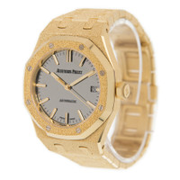 18kt yellow gold case with a 18kt yellow gold bracelet. Fixed 18kt yellow gold bezel. Silver-toned mirror dial dial with index hour markers. Minute markers around the outer rim. Dial Type: Analog. Luminescent hands and markers. Date display at the 3 o'clock position. Audemars Piguet Calibre 3120 Automatic movement, containing 40 Jewels, composed of 280 parts, bitting at 21600 vph, and has a power reserve of approximately 60 hours. Scratch resistant sapphire crystal. Screw down crown. Transparent case back. Octagon case shape, case size: 37 mm, case thickness: 9.8 mm. Ap folding clasp. Water resistant at 50 meters / 165 feet. Functions: date, hour, minute, second. Luxury watch style. Watch label: Swiss Made. Audemars Piguet Royal Oak Frosted Gold "Carolina Bucci" Watch 15454BA.GG.1259BA.02. INFORMATION Brand: Audemars Piguet Series: Royal Oak Collection Name: Royal Oak Gender: Womens Model: 15454BA.GG.1259BA.02 Watch Label: Swiss Made Movement: Automatic Engine: Audemars Piguet Calibre 3120 Power Reserve: 60 hours CASE Case Size: 37 mm Case Thickness: 9.8 mm Case Material: 18kt Yellow Gold Case Shape: Octagon Case Back: Transparent BAND Band Material: 18kt Yellow Gold Band Type: Bracelet Clasp: AP folding DIAL Dial Color: Silver-toned mirror dial Type: Analog Crystal: Scratch Resistant Sapphire Dial Markers: Index Second Markers: Minute Markers around the outer rim Luminiscence: Hands and Markers Bezel: Fixed Bezel Material: 18kt Yellow Gold Crown: Screw Down FEATURES Water Resistance: 50 meters / 165 feet Calendar: Date display at the 3 o'clock position Functions: Date, Hour, Minute, Second Watch Features: Gold, Analog ADDITIONAL INFO Watch Style: Luxury Warranty: 2 Year Jomashop Warranty Jomashop Sku: AP15454BAGG1259BA02 Department: Watches Category: Watches
