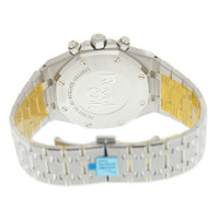 18kt white gold case with a 18kt white gold bracelet. 8 screws fixed 18kt white gold bezel. Blue grande tapisserie dial with index hour markers. Dial Type: Analog. Date display between 4 and 5 o'clock position. Chronograph - three sub-dials displaying: 60 second, 30 minute and 12 hour. Audemars Piguet Calibre 2385 Automatic movement, containing 37 Jewels, composed of 304 parts, bitting at 21600 vph, and has a power reserve of approximately 40 hours. Scratch resistant sapphire crystal. Screw down crown. Transparent case back. Octagon case shape, case size: 41 mm, case thickness: 11 mm. Deployment clasp. Water resistant at 50 meters / 165 feet. Functions: chronograph, column wheel, date, hour, minute, small second. Dress watch style. Watch label: Swiss Made. Audemars Piguet Royal Oak Frosted White Gold Chronograph Automatic Men's Watch 26331BC.GG.1224BC.02. CASE Case Size: 41 Case Thickness: 11 mm Case Material: 18kt White Gold Case Shape: Octagon Case Back: Transparent BAND Band Material: 18kt White Gold Band Type: Bracelet Clasp: Deployment DIAL Dial Color: Blue Grande Tapisserie Type: Analog Crystal: Scratch Resistant Sapphire Dial Markers: Index Sub Dials: Three - 60 Second, 30 Minute and 12 Hour Bezel: 8 Screws Fixed Bezel Material: 18kt White Gold Crown: Screw Down INFORMATION Brand: Audemars Piguet Series: Royal Oak Collection Name: Royal Oak Gender: Mens Model: 26331BC.GG.1224BC.02 Watch Label: Swiss Made Movement: Automatic Engine: Audemars Piguet Calibre 2385 Power Reserve: 40 hours FEATURES Water Resistance: 50 meters / 165 feet Calendar: Date display between 4 and 5 o'clock position Functions: Chronograph, Column Wheel, Date, Hour, Minute, Small Second Watch Features: Chronograph, Gold, Analog ADDITIONAL INFO Watch Style: Dress Warranty: 2 Year Jomashop Warranty Jomashop Sku: AP26331BCGG1224BC02 Department: Watches Category: Watches