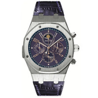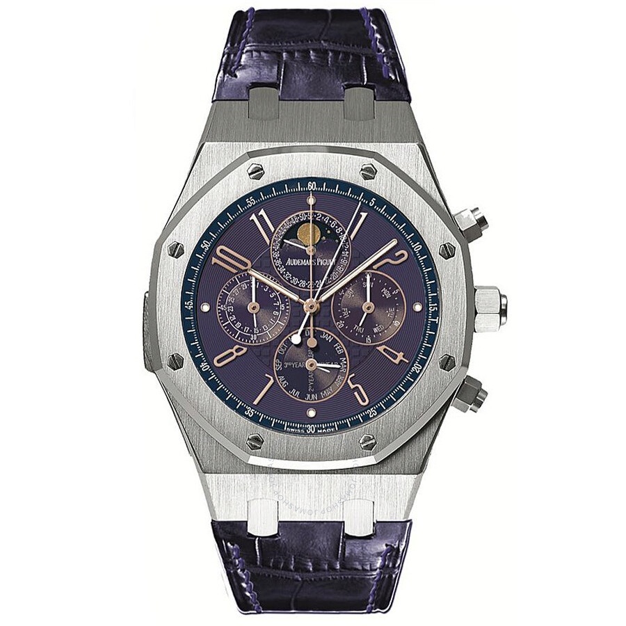 18 kt white gold case with a blue alligator leather strap. Fixed bezel. Blue waffle design dial with silver-tone hands and Arabic numeral hour markers. Minute markers around the outer rim. Dial Type: Analog. Luminescent hands and markers. Perpetual calendar, month, day of the week and date sub-dials. Chronograph - two sub-dials displaying: 60 second and 30 minute. Automatic movement. AP Caliber 2885 engine. Scratch resistant sapphire crystal. Screw down crown. Skeleton case back. Case diameter: 44 mm. Octagon case shape. Deployment clasp with push button. Water resistant at 20 meters / 65 feet. Functions: chronograph, month, day, date, hour, minute, second, moonphase. Luxury watch style. Watch label: Swiss Made. Audemars Piguet Royal Oak Grande Complication Automatic White Gold Men's Watch 26566BC.OO.D305CR.01. GENERAL Color: Blue / Gold / Skeleton / White CASE Case Size: 44 Case Material: 18kt White Gold Case Shape: Octagon Case Back: Skeleton BAND Band Material: Alligator Leather Band Type: Strap Band Color: Blue Clasp: Deployment with Push Button Release DIAL Dial Color: Blue waffle design Type: Analog Crystal: Scratch Resistant Sapphire Hands: Silver-tone Dial Markers: Arabic Numeral Second Markers: Minute Markers around the outer rim Sub Dials: Two - 60 Second and 30 Minute Luminiscence: Hands and Markers Bezel: Fixed Bezel Material: 18kt White Gold Crown: Screw Down INFORMATION Brand: Audemars Piguet Series: Royal Oak Collection Name: Royal Oak Gender: Mens Model: 26566BC.OO.D305CR.01 Watch Label: Swiss Made Movement: Automatic Engine: Audemars Piguet Calibre 2885 Power Reserve: 45 hours FEATURES Water Resistance: 20 meters / 65 feet Calendar: Perpetual calendar, month, day of the week and date sub-dials Functions: Perpetual Calendar, Moon Phase, Chronograph, Column Wheel, Rattrapante, Month, Date, Day, Hour, Minute, Small Second, Minute Repeater Watch Features: Alligator Leather, Analog, Rattrapante, Month, Repeater, Perpetual, Gold, Leather, Moon Phase, Chronograph ADDITIONAL INFO Watch Style: Luxury Warranty: 2 Year Jomashop Warranty Jomashop Sku: AP26566BCOOD305CR01 Item Variation: 26566BC OO D305CR 01, 26566BC-OO-D305CR-01, 26566BCOOD305CR01 Department: Watches Category: Watches