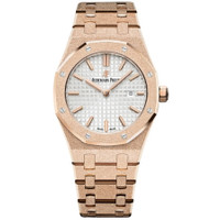 Hammered 18kt rose gold case with a hammered 18kt rose gold bracelet. Fixed 18kt rose gold bezel. Silver grande tapisserie dial with rose gold-tone hands and index hour markers. Dial Type: Analog. Luminescent hands and markers. Date display at the 3 o'clock position. Audemars Piguet Calibre 2713 hand wind movement. Scratch resistant sapphire crystal. Case size: 33 mm. Case thickness: 7 mm. Octagon case shape. Water resistant at 50 meters / 165 feet. Functions: date, hour, minute. Luxury watch style. Watch label: Swiss Made. Audemars Piguet Royal Oak Ladies 18K Rose Gold Hand Wound Watch 67653OR.GG.1263OR.01. INFORMATION Brand: Audemars Piguet Series: Royal Oak Collection Name: Royal Oak Gender: Womens Model: 67653OR.GG.1263OR.01 Watch Label: Swiss Made Movement: Hand Wind Engine: Audemars Piguet Calibre 2713 CASE Case Size: 33 mm Case Thickness: 7 mm Case Material: Hammered 18kt Rose Gold Case Shape: Octagon BAND Band Material: Hammered 18kt Rose Gold Band Type: Bracelet DIAL Dial Color: Silver Grande Tapisserie Type: Analog Crystal: Scratch Resistant Sapphire Hands: Rose Gold-tone Dial Markers: Index Luminiscence: Hands and Markers Bezel: 8 Screws Fixed Bezel Material: 18kt Rose Gold FEATURES Water Resistance: 50 meters / 165 feet Calendar: Date display at the 3 o'clock position Functions: Date, Hour, Minute Watch Features: Gold, Analog ADDITIONAL INFO Watch Style: Luxury Warranty: 2 Year Jomashop Warranty Jomashop Sku: AP67653ORGG1263OR01 Department: Watches Category: Watches