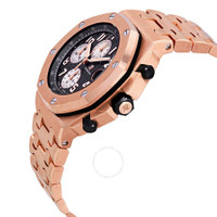 18-carat pink gold case with a 18-carat pink gold bracelet. 8 screws fixed 18-carat pink gold bezel. Grey ruthenium dial with pink gold hands and Arabic numeral hour markers. Tachymeter scale around the inner rim. Dial Type: Analog. Luminescent hands and markers. Date display at the 3 o'clock position. Chronograph - three sub-dials displaying: 60 second, 30 minute and 12 hour. Audemars Piguet Calibre 3126/3840 Automatic movement, based upon Audemars Piguet 3120, containing 59 Jewels, composed of 365 parts, bitting at 21600 vph, and has a power reserve of approximately 50 hours. Scratch resistant sapphire crystal. Screw down crown. Transparent case back. Octagon case shape, case size: 42 mm, case thickness: 14.6 mm. Folding clasp. Water resistant at 100 meters / 330 feet. Functions: chronograph, date, hour, minute, second. Luxury watch style. Watch label: Swiss Made. Audemars Piguet Royal Oak Offshore 18-carat Pink Gold Chronograph Automatic Men's Watch 26470OR.OO.1000OR.02. CASE Case Size: 42 Case Thickness: 14.6 mm Case Material: 18-carat Pink Gold Case Shape: Octagon Case Back: Transparent BAND Band Material: 18-carat Pink Gold Band Type: Bracelet Clasp: Folding DIAL Dial Color: Grey Ruthenium Type: Analog Crystal: Scratch Resistant Sapphire Hands: Pink Gold Dial Markers: Arabic Numeral Second Markers: Tachymeter Scale around the inner rim Sub Dials: Three - 60 Second, 30 Minute and 12 Hour Luminiscence: Hands and Markers Bezel: 8 Screws Fixed Bezel Material: 18-carat Pink Gold Crown: Screw Down INFORMATION Brand: Audemars Piguet Series: Royal Oak Offshore Collection Name: Royal Oak Offshore Gender: Mens Model: 26470OR.OO.1000OR.02 Watch Label: Swiss Made Movement: Automatic Engine: Audemars Piguet Calibre 3126/3840 Power Reserve: 50 hours FEATURES Water Resistance: 100 meters / 330 feet Calendar: Date display at the 3 o'clock position Functions: Chronograph, Date, Hour, Minute, Second Watch Features: Chronograph, Gold, Analog ADDITIONAL INFO Watch Style: Luxury Warranty: 2 Year Jomashop Warranty Jomashop Sku: AP26470OROO1000OR02 Department: Watches Category: Watches