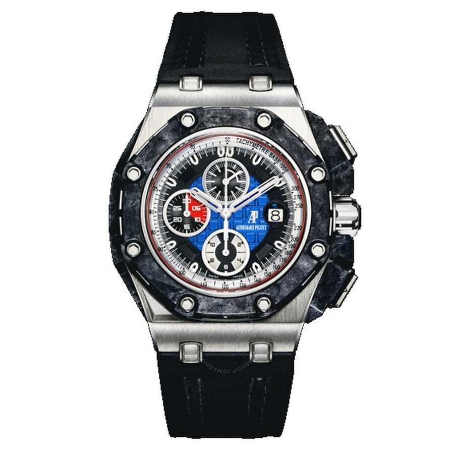 950 platinum and black ceramic case with a black leather strap. Fixed bezel. Blue and black dial with silver-tone hands and stick hour markers. Minute markers around the outer rim. Dial Type: Analog. Luminescent hands and markers. Date display at the 3 o'clock position. Chronograph - three sub-dials displaying: 60 second, 30 minute and 12 hour. Automatic movement with 50 hour power reserve. Ap caliber 3126/3840 engine. Scratch resistant sapphire crystal. Skeleton case back. Case diameter: 44 mm. Case thickness: 15.65 mm. Octagon case shape. Tang clasp. Water resistant at 100 meters / 330 feet. Functions: chronograph, date, hour, minute, second. Luxury watch style. Watch label: Swiss Made. Audemars Piguet Royal Oak OffShore Automatic Chronograph Platinum Men's Watch 26290PO.OO.A001VE.01. GENERAL Color: Black / Blue / Platinum / Skeleton CASE Case Size: 44 Case Thickness: 15.65 mm Case Material: 950 Platinum and Black Ceramic Case Shape: Octagon Case Back: Skeleton BAND Band Material: Leather Band Type: Strap Band Color: Black Clasp: Tang DIAL Dial Color: Blue and black Type: Analog Crystal: Scratch Resistant Sapphire Hands: Silver-tone Dial Markers: Stick Second Markers: Minute Markers around the outer rim Sub Dials: Three - 60 Second, 30 Minute and 12 Hour Luminiscence: Hands and Markers Bezel: Fixed Crown: Screw Down INFORMATION Brand: Audemars Piguet Series: Royal Oak Offshore Collection Name: Royal Oak Offshore Gender: Mens Model: 26290PO.OO.A001VE.01 Watch Label: Swiss Made Movement: Automatic Engine: Audemars Piguet Calibre 3126/3840 Power Reserve: 50 hours FEATURES Water Resistance: 100 meters / 330 feet Calendar: Date display at the 3 o'clock position Functions: Chronograph, Date, Hour, Minute, Small Second Watch Features: Chronograph, Leather, Ceramic, Platinum, Analog ADDITIONAL INFO Watch Style: Luxury Warranty: 2 Year Jomashop Warranty Jomashop Sku: AP26290POOOA001VE01 Item Variation: 26290PO OO A001VE 01, 26290PO-OO-A001VE-01, 26290POOOA001VE01 Department: Watches Category: Watches