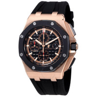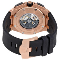 18kt rose gold case with a black rubber strap. 8 screws fixed black ceramic bezel. Black mega tapisserie dial with luminous rose gold-tone hands and index hour markers. Minute markers. tachymeter markings around the outer rim. Dial Type: Analog. Luminescent hands and markers. Date display at the 3 o'clock position. Chronograph - three sub-dials displaying: 60 second, 30 minute and 12 hour. Audemars Piguet Calibre 3126/3840 Automatic movement, based upon Audemars Piguet 3120, containing 59 Jewels, composed of 365 parts, bitting at 21600 vph, and has a power reserve of approximately 50 hours. Scratch resistant sapphire crystal. Screw down crown. Transparent case back. Octagon case shape, case size: 44 mm, case thickness: 14.4 mm. Tang clasp. Water resistant at 100 meters / 330 feet. Functions: chronograph, tachymeter, date, hour, minute, second. Luxury watch style. Watch label: Swiss Made. Audemars Piguet Royal Oak Offshore Black Mega Tapisserie Dial Men's Chronograph Watch 26401RO.OO.A002CA.02. CASE Case Size: 44 Case Thickness: 14.4 mm Case Material: Gold Case Shape: Octagon Case Back: Transparent BAND Band Material: Rubber Band Type: Strap Band Color: Black Clasp: Tang DIAL Dial Color: Black Mega Tapisserie Type: Analog Crystal: Scratch Resistant Sapphire Hands: Luminous Rose Gold-tone Dial Markers: Index Second Markers: Minute Markers. Tachymeter Markings around the outer rim Sub Dials: Three - 60 Second, 30 Minute and 12 Hour Luminiscence: Hands and Markers Bezel: 8 Screws Fixed Bezel Color: Black Bezel Material: Ceramic Crown: Screw Down INFORMATION Brand: Audemars Piguet Series: Royal Oak Offshore Collection Name: Royal Oak Offshore Gender: Mens Model: 26401RO.OO.A002CA.02 Watch Label: Swiss Made Movement: Automatic Engine: Audemars Piguet Calibre 3126/3840 Power Reserve: 50 hours FEATURES Water Resistance: 100 meters / 330 feet Calendar: Date display at the 3 o'clock position Functions: Chronograph, Tachymeter, Date, Hour, Minute, Second Watch Features: Chronograph, Rubber, Gold, Ceramic, Analog ADDITIONAL INFO Watch Style: Luxury Warranty: 2 Year Jomashop Warranty Jomashop Sku: AP26401ROOOA002CA02 Department: Watches Category: Watches