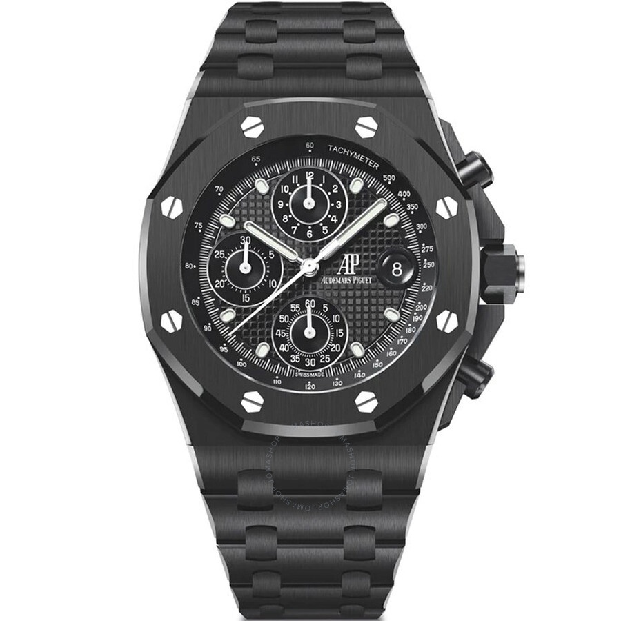 Black ceramic case and bracelet. Fixed black ceramic bezel. Black dial with silver-tone hands and index hour markers. Minute markers around the outer rim. Luminescent hands and markers. Date display at the 3 o'clock position. Chronograph - three sub-dials displaying: 60 second, 30 minute and 12 hour. Audemars Piguet Calibre 4404 automatic movement with a 70-hour power reserve. Scratch resistant sapphire crystal. Screw down crown. Transparent see through case back. Round case shape, case size: 42 mm, case thickness: 15.3 mm. Fold over clasp with a safety release. Water resistant at 100 meters / 330 feet. Functions: chronograph, date, hour, minute, second. Royal Oak Offshore Series. Luxury watch style. Watch label: Swiss Made. Audemars Piguet Royal Oak Offshore Chronograph Automatic Black Dial Men's Watch 26238CE.OO.1300CE.01. CASE Case Size: 42 Case Thickness: 15.3 mm Case Material: Ceramic Case Shape: Round Case Back: Transparent See Through BAND Band Material: Ceramic Band Type: Bracelet Band Color: Black Clasp: Fold Over with Safety Release DIAL Dial Color: Black Crystal: Scratch Resistant Sapphire Hands: Silver-tone Dial Markers: Index Second Markers: Minute Markers around the outer rim Sub Dials: Three - 60 Second, 30 Minute and 12 Hour Luminiscence: Hands and Markers Bezel: Fixed Bezel Color: Black Bezel Material: Ceramic Crown: Screw Down INFORMATION Brand: Audemars Piguet Series: Royal Oak Offshore Collection Name: Royal Oak Offshore Gender: Mens Model: 26238CE.OO.1300CE.01 Watch Label: Swiss Made Movement: Automatic Engine: Audemars Piguet Calibre 4404 Power Reserve: 70 hours FEATURES Water Resistance: 100 meters / 330 feet Calendar: Date display at the 3 o'clock position Functions: Chronograph, Date, Hour, Minute, Second Watch Features: Chronograph, Ceramic ADDITIONAL INFO Watch Style: Luxury Warranty: 2 Year Jomashop Warranty Jomashop Sku: AP26238CEOO1300CE01 Department: Watches Category: Watches