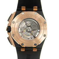 Ceramic case with a grey rubber strap. Fixed 18kt rose gold bezel. Black dial with Arabic numeral hour markers. Dial Type: Analog. Date display at the 3 o'clock position. Chronograph - three sub-dials displaying: 60 second, 30 minute and 12 hour. Audemars Piguet Calibre 3126/3840 Automatic movement, based upon Audemars Piguet 3120, containing 59 Jewels, composed of 365 parts, bitting at 21600 vph, and has a power reserve of approximately 50 hours. Scratch resistant sapphire crystal. Screw down crown. Transparent see through case back. Case size: 44 mm, case thickness: 14.4 mm. Tang clasp. Water resistant at 100 meters / 330 feet. Functions: chronograph, date, hour, minute, small second. Royal Oak Offshore Series. Casual watch style. Watch label: Swiss Made. Audemars Piguet Royal Oak Offshore Chronograph Automatic Black Dial Men's Watch 26405NR.OO.A002CA.01. CASE Case Size: 44 Case Thickness: 14.4 mm Case Material: Ceramic Case Shape: Octagon Case Back: Transparent See Through BAND Band Material: Rubber Band Type: Strap Band Color: Grey Clasp: Tang DIAL Dial Color: Black Type: Analog Crystal: Scratch Resistant Sapphire Dial Markers: Arabic Numeral Sub Dials: Three - 60 Second, 30 Minute and 12 Hour Bezel: Fixed Bezel Material: 18kt Rose Gold Crown: Screw Down INFORMATION Brand: Audemars Piguet Series: Royal Oak Offshore Collection Name: Royal Oak Offshore Gender: Mens Model: 26405NR.OO.A002CA.01 Watch Label: Swiss Made Movement: Automatic Engine: Audemars Piguet Calibre 3126/3840 Power Reserve: 50 hours FEATURES Water Resistance: 100 meters / 330 feet Calendar: Date display at the 3 o'clock position Functions: Chronograph, Date, Hour, Minute, Small Second Watch Features: Chronograph, Rubber, Gold, Ceramic, Analog ADDITIONAL INFO Watch Style: Casual Warranty: 2 Year Jomashop Warranty Jomashop Sku: AP26405NROOA002CA01 Department: Watches Category: Watches