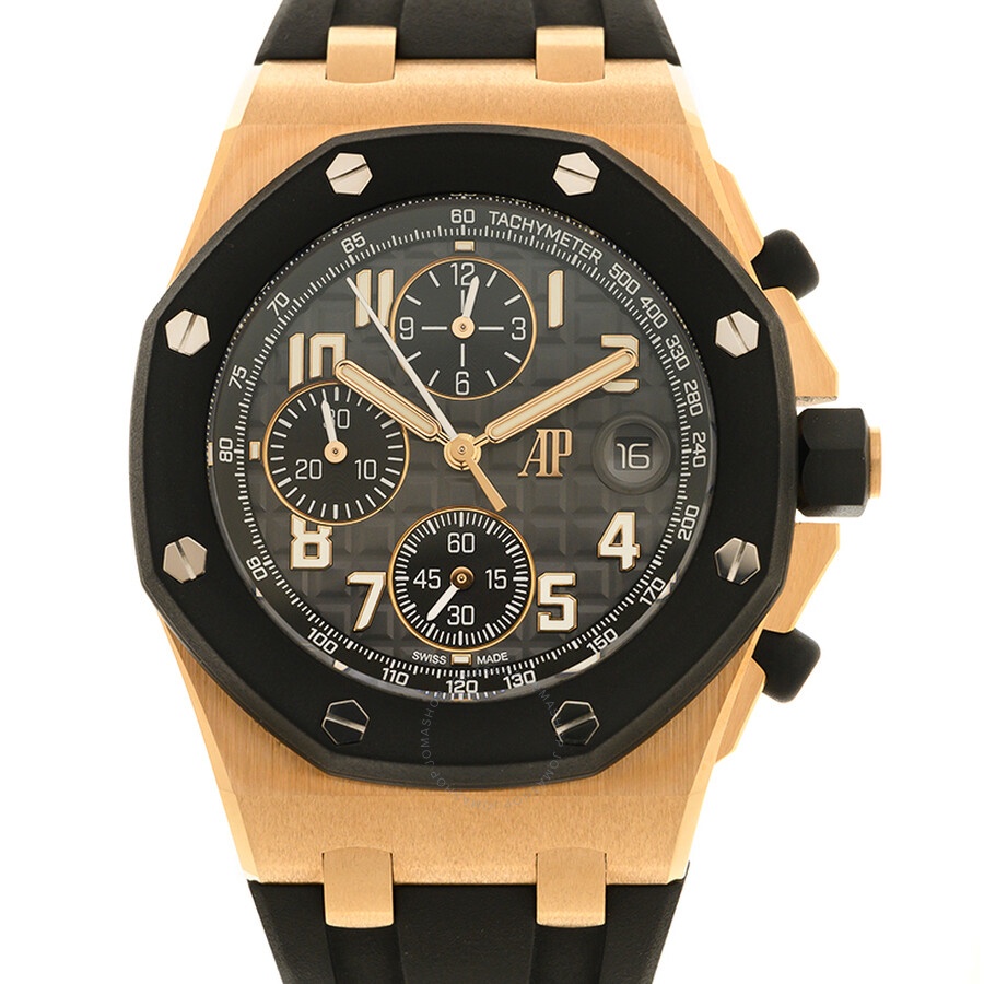 Rose gold-tone 18kt rose gold case with a black rubber strap. Fixed black rubber bezel. Grey dial with rose gold-tone hands and Arabic numeral hour markers. Minute markers around the outer rim. Dial Type: Analog. Luminescent hands and markers. Date display at the 3 o'clock position. Chronograph - three sub-dials displaying: 60 second, 30 minute and 12 hour. Audemars Piguet Calibre 4404 automatic movement. Scratch resistant sapphire crystal. Screw down crown. Transparent see through case back. Round case shape, case size: 42 mm, case thickness: 15.3 mm. Buckle clasp. Water resistant at 100 meters / 330 feet. Functions: chronograph, date, hour, minute, second. Additional Info: original box, international warranty card, manual (complete accessories). Royal Oak Offshore Series. Luxury watch style. Watch label: Swiss Made. Audemars Piguet Royal Oak Offshore Chronograph Automatic Grey Dial Men's Watch 26238OK.OO.A002CA.01. CASE Case Size: 42 Case Thickness: 15.3 mm Case Material: 18kt Rose Gold Case Shape: Round Case Back: Transparent See Through BAND Band Material: Rubber Band Type: Strap Band Color: Black Clasp: Buckle DIAL Dial Color: Grey Type: Analog Crystal: Scratch Resistant Sapphire Hands: Rose Gold-tone Dial Markers: Arabic Numeral Second Markers: Minute Markers around the outer rim Sub Dials: Three - 60 Second, 30 Minute and 12 Hour Luminiscence: Hands and Markers Bezel: Fixed Bezel Color: Black Bezel Material: Rubber Crown: Screw Down INFORMATION Brand: Audemars Piguet Series: Royal Oak Offshore Collection Name: Royal Oak Offshore Gender: Mens Model: 26238OK.OO.A002CA.01 Watch Label: Swiss Made Movement: Automatic Engine: Audemars Piguet Calibre 4404 FEATURES Water Resistance: 100 meters / 330 feet Calendar: Date display at the 3 o'clock position Functions: Chronograph, Date, Hour, Minute, Second Watch Features: Chronograph, Rubber, Gold, Analog ADDITIONAL INFO Watch Style: Luxury Warranty: 2 Year Jomashop Warranty Additional Info: Original Box, Manual (Complete Accessories) Jomashop Sku: AP26238OKOOA002CA01 Department: Watches Category: Watches