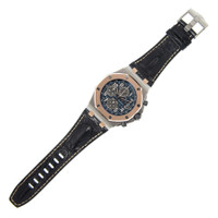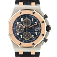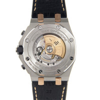 Silver-tone stainless steel case with a black alligator leather strap. 8 screws fixed 18kt rose gold bezel. Black dial with gold-tone hands and Arabic hour markers. Minute markers. tachymeter markings around the outer rim. Dial Type: Analog. Luminescent hands and markers. Date display at the 3 o'clock position. Chronograph - three sub-dials displaying: 60 second, 30 minute and 12 hour. Audemars Piguet Calibre 3126/3840 Automatic movement, based upon Audemars Piguet 3120, containing 59 Jewels, composed of 365 parts, bitting at 21600 vph, and has a power reserve of approximately 50 hours. Scratch resistant sapphire crystal. Pull / push crown. Skeleton case back. Octagon case shape, case size: 42 mm, case thickness: 14.54 mm. Tang clasp. Water resistant at 100 meters / 330 feet. Functions: chronograph, date, hour, minute, small second. Luxury watch style. Watch label: Swiss Made. Audemars Piguet Royal Oak Offshore Chronograph Automatic Men's Watch 26471SR.OO.D101CR.01. CASE Case Size: 42 Case Thickness: 14.54 mm Case Material: Stainless Steel Case Shape: Octagon Case Back: Skeleton BAND Band Material: Alligator Leather Band Type: Strap Band Color: Black Clasp: Tang DIAL Dial Color: Black Type: Analog Crystal: Scratch Resistant Sapphire Hands: Gold-tone Dial Markers: Arabic Second Markers: Minute Markers. Tachymeter Markings around the outer rim Sub Dials: Three - 60 Second, 30 Minute and 12 Hour Luminiscence: Hands and Markers Bezel: 8 Screws Fixed Bezel Material: 18kt Rose Gold Crown: Pull / Push INFORMATION Brand: Audemars Piguet Series: Royal Oak Offshore Collection Name: Royal Oak Offshore Gender: Mens Model: 26471SR.OO.D101CR.01 Watch Label: Swiss Made Movement: Automatic Engine: Audemars Piguet Calibre 3126/3840 Power Reserve: 50 hours FEATURES Water Resistance: 100 meters / 330 feet Calendar: Date display at the 3 o'clock position Functions: Chronograph, Date, Hour, Minute, Small Second Watch Features: Alligator Leather, Analog, Gold, Leather, Stainless Steel, Chronograph ADDITIONAL INFO Watch Style: Luxury Warranty: 2 Year Jomashop Warranty Jomashop Sku: AP26471SROOD101CR01 Department: Watches Category: Watches