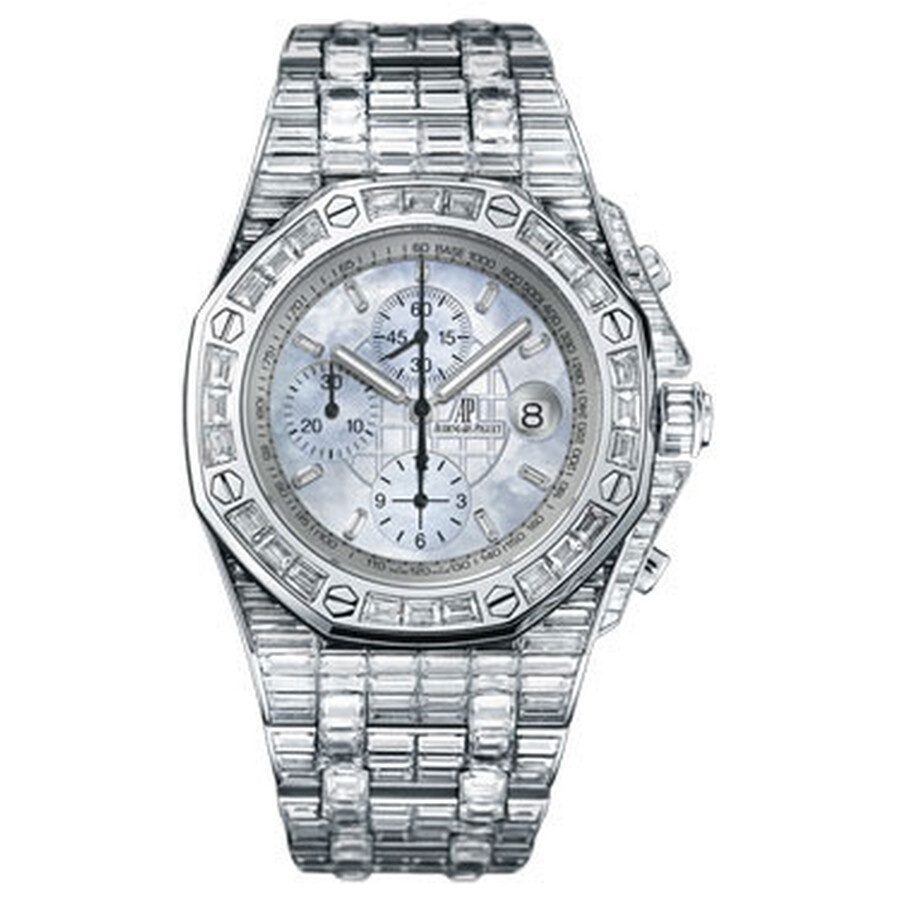 Baguette diamond-set 18kt white gold case with a white gold-tone baguette diamond-set 18kt white gold bracelet. 8 screws fixed diamond set bezel. Mother of pearl dial with luminous hands and diamond hour markers. Tachymeter scale appears around the outer rim. Dial Type: Analog. Date display at the 3 o'clock position. Chronograph - three sub-dials displaying: 60 second, 30 minute and 12 hour. Audemars Piguet Calibre 3126/3840 Automatic movement, based upon Audemars Piguet 3120, containing 59 Jewels, composed of 365 parts, bitting at 21600 vph, and has a power reserve of approximately 50 hours. Scratch resistant sapphire crystal. Pull / push crown. Solid case back. Octagon case shape, case size: 42 mm, case thickness: 15 mm. Water resistant at 20 meters / 65 feet. Functions: chronograph, date, hour, minute, small second. Luxury watch style. Watch label: Swiss Made. Item Variations: 26174BC ZZ 8042BC 01, 26174BC-ZZ-8042BC-01, 26174BCZZ8042BC01. Audemars Piguet Royal Oak Offshore Chronograph Diamond Men's Watch 26174BC.ZZ.8042BC.01. GENERAL Color: Gold / Mother of pearl / White CASE Case Size: 42 Case Thickness: 15 mm Case Material: Baguette Diamond-Set 18kt White Gold Case Shape: Octagon Case Back: Solid BAND Band Material: Baguette Diamond-Set 18kt White Gold Band Type: Bracelet Band Color: White Gold-tone DIAL Dial Color: Mother of Pearl Type: Analog Crystal: Scratch Resistant Sapphire Hands: Luminous Dial Markers: Diamond Second Markers: Tachymeter scale appears around the outer rim Sub Dials: Three - 60 Second, 30 Minute and 12 Hour Bezel: 8 Screws Fixed Bezel Material: Diamond Set Crown: Pull / Push INFORMATION Brand: Audemars Piguet Series: Royal Oak Offshore Chronograph Collection Name: Royal Oak Offshore Chronograph Gender: Mens Model: 26174BC.ZZ.8042BC.01 Watch Label: Swiss Made Movement: Automatic Engine: Audemars Piguet Calibre 3126/3840 Power Reserve: 55 hours FEATURES Water Resistance: 20 meters / 65 feet Calendar: Date display at the 3 o'clock position Functions: Chronograph, Date, Hour, Minute, Small Second Watch Features: Diamond, Chronograph, Gold, Analog ADDITIONAL INFO Watch Style: Luxury Warranty: 2 Year Jomashop Warranty Jomashop Sku: AP26174BCZZ8042BC01 Item Variation: 26174BC ZZ 8042BC 01, 26174BC-ZZ-8042BC-01, 26174BCZZ8042BC01 Department: Watches Category: Watches